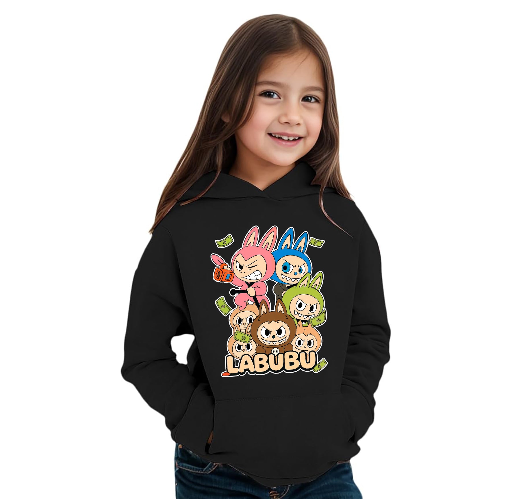 Felpa invernale in misto cotone poliestere, colore bianco o nero con stampa frontale ispirata ai famosissimi peluche Labubu. Modello Unisex per bambino, bambina e adulti. Felpa con Cappuccio o modello Girocollo. Consulta la tabella taglie e scegli quella che fa per te.