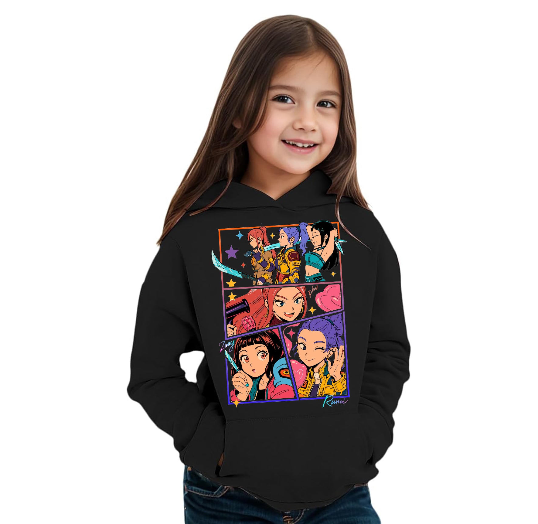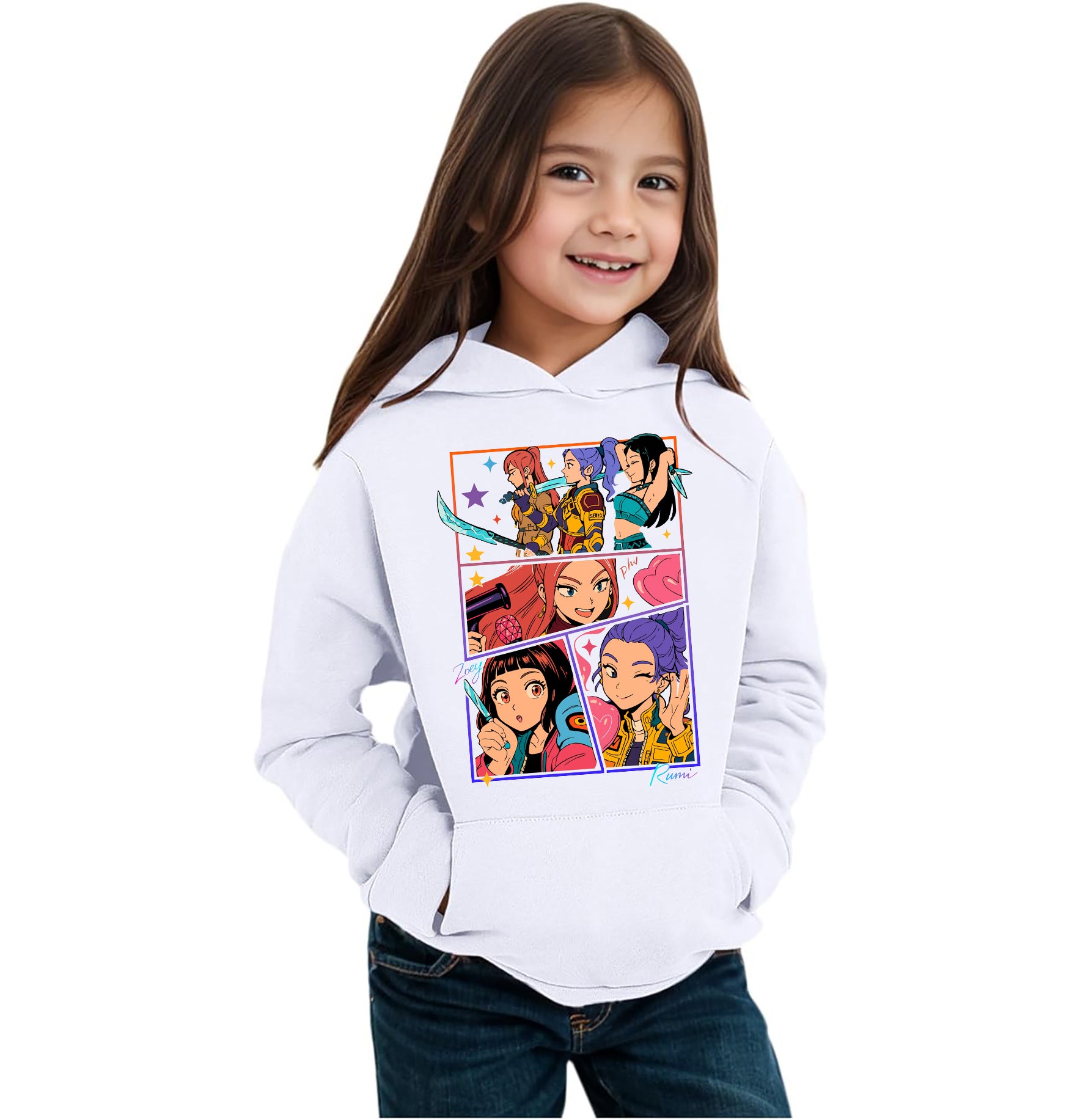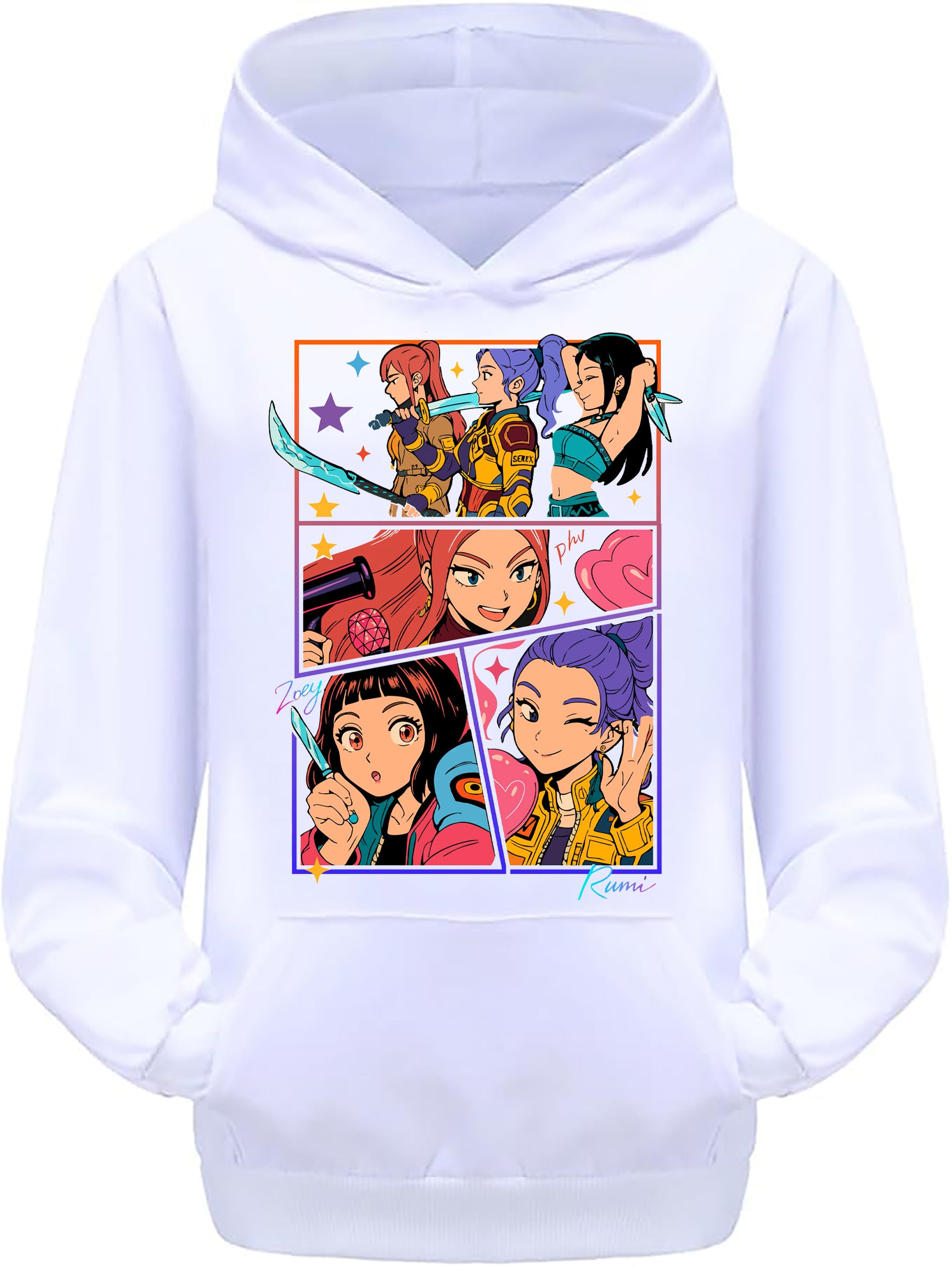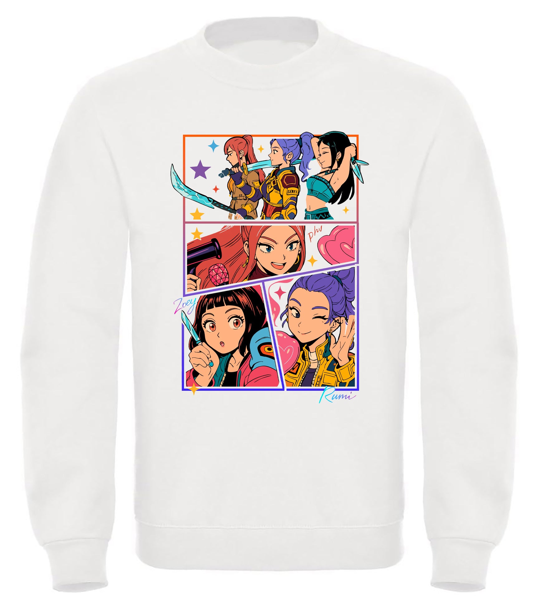 Felpa invernale in misto cotone poliestere, colore bianco o nero con stampa frontale ispirata alle Huntrix. Modello Unisex per bambino, bambina e adulti. Felpa con Cappuccio o modello Girocollo. Consulta la tabella taglie e scegli quella che fa per te.