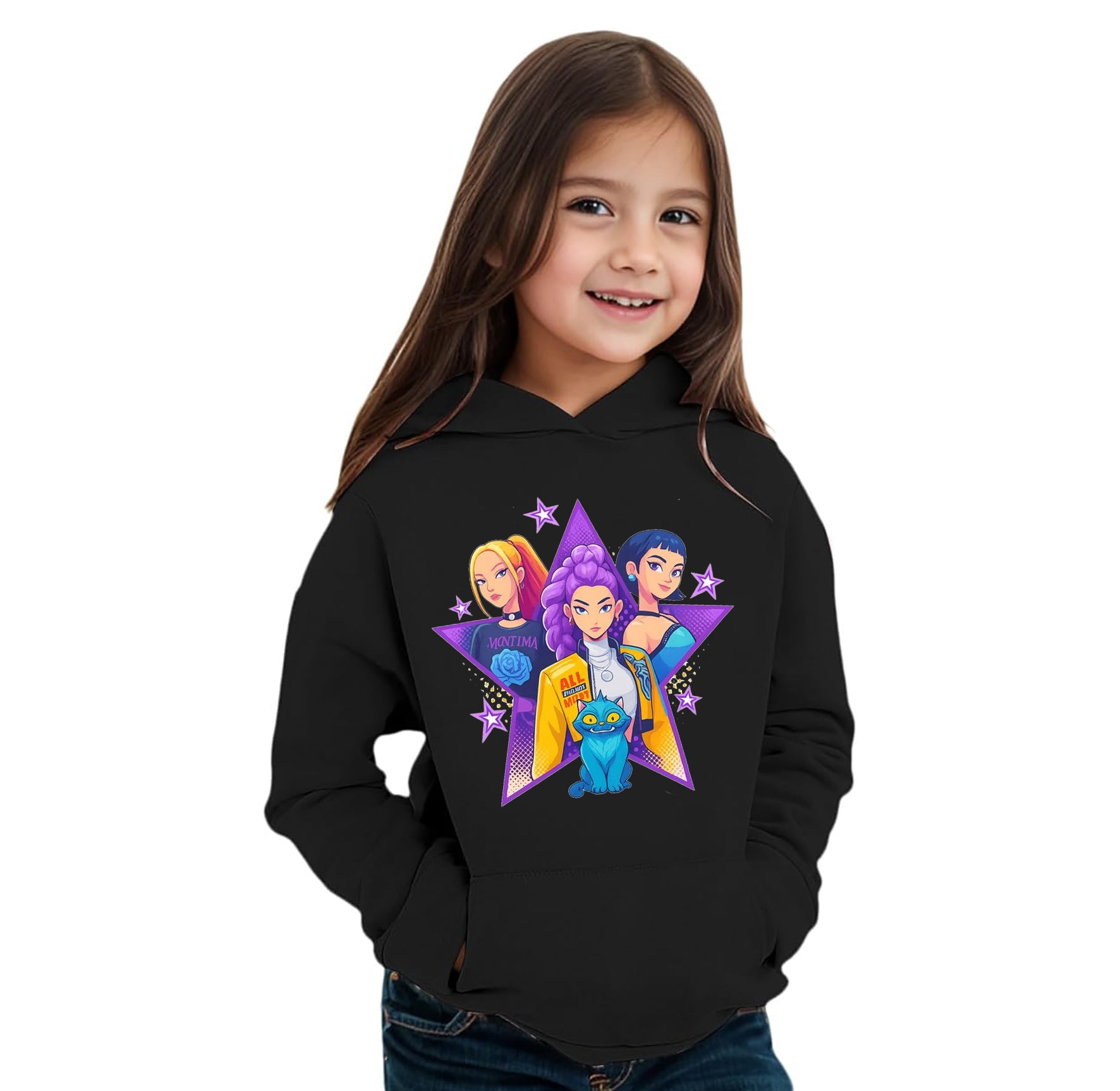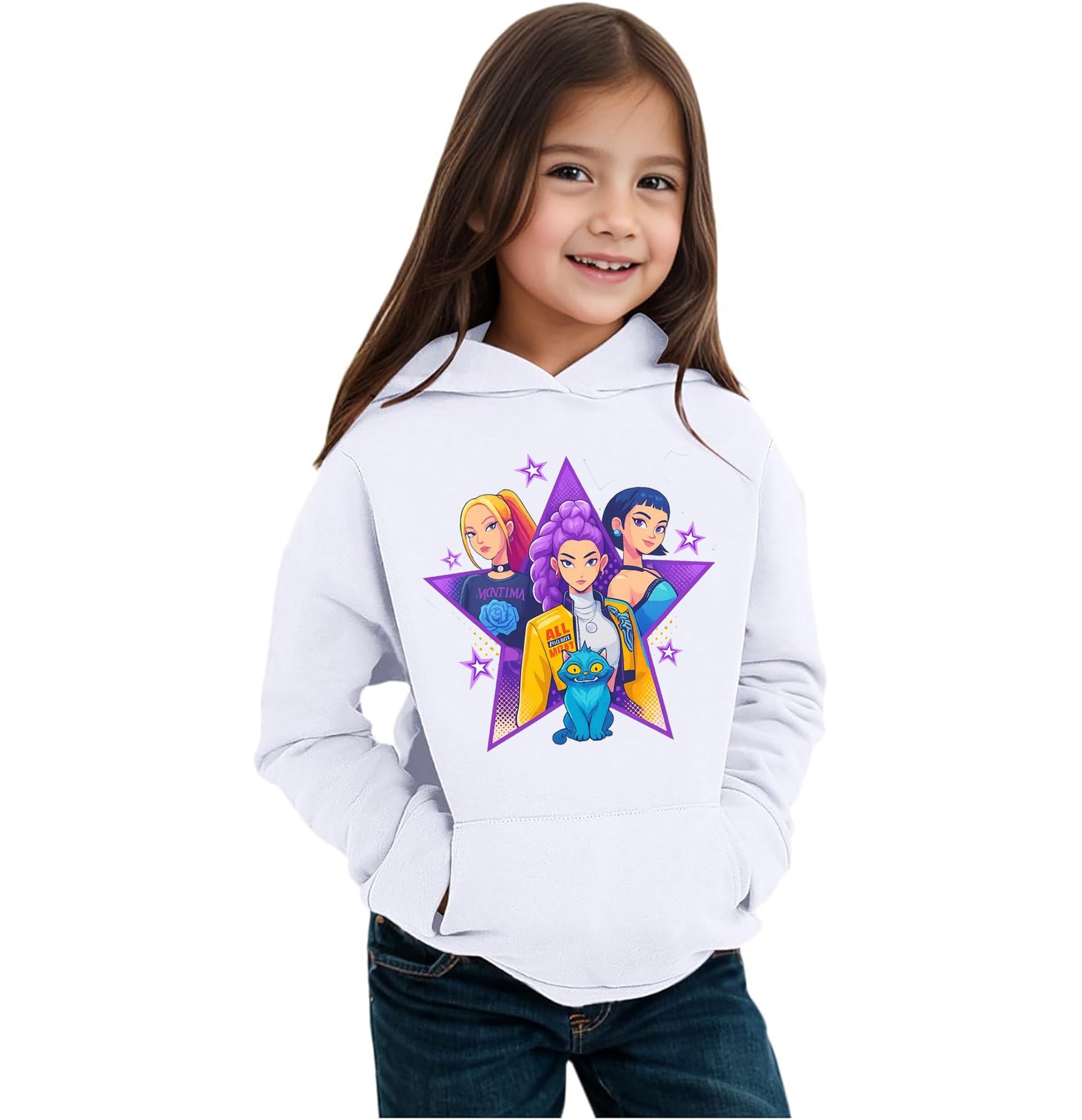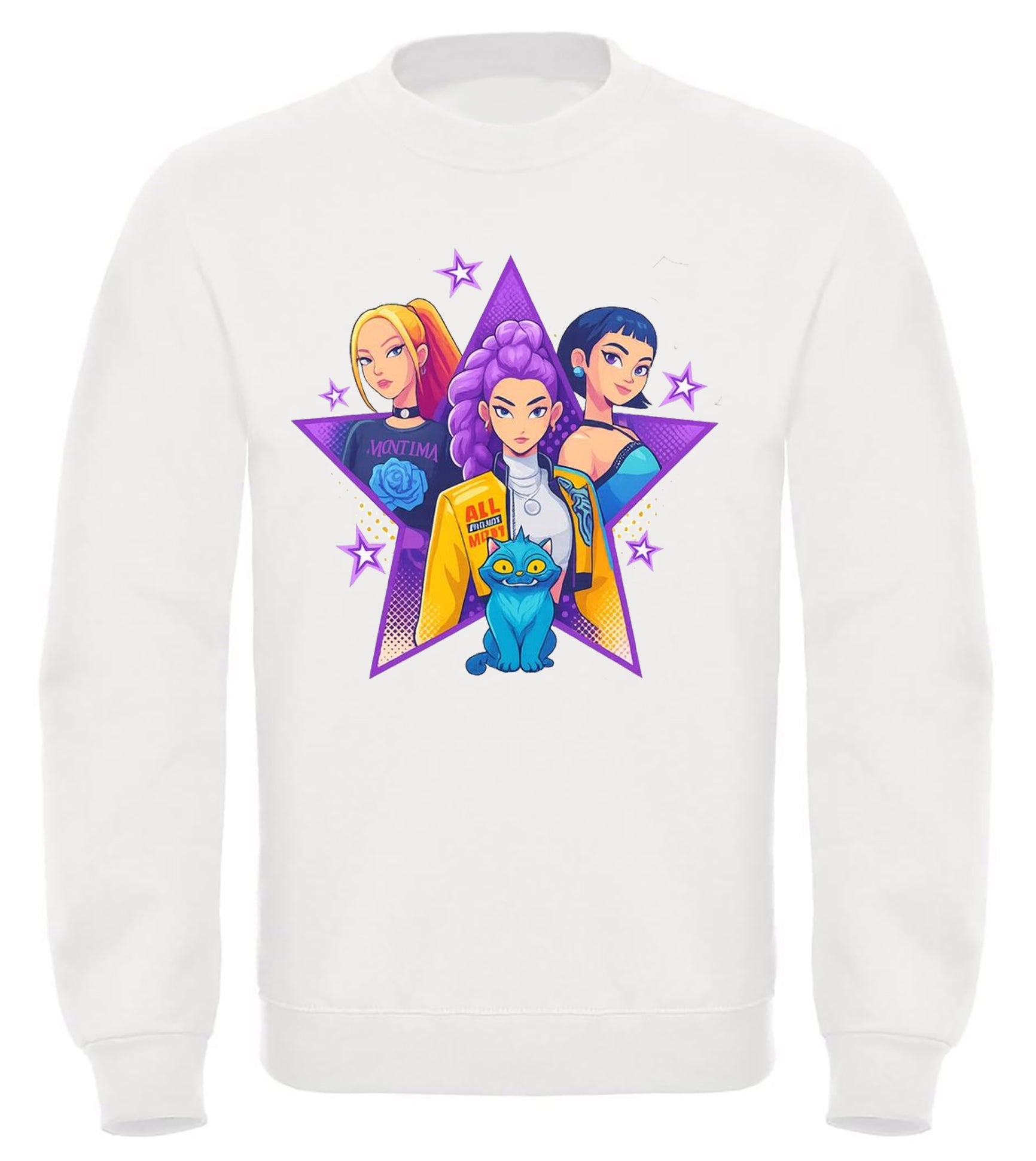 Felpa invernale in misto cotone poliestere, colore bianco o nero con stampa frontale ispirata alle Huntrix. Modello Unisex per bambino, bambina e adulti. Felpa con Cappuccio o modello Girocollo. Consulta la tabella taglie e scegli quella che fa per te.