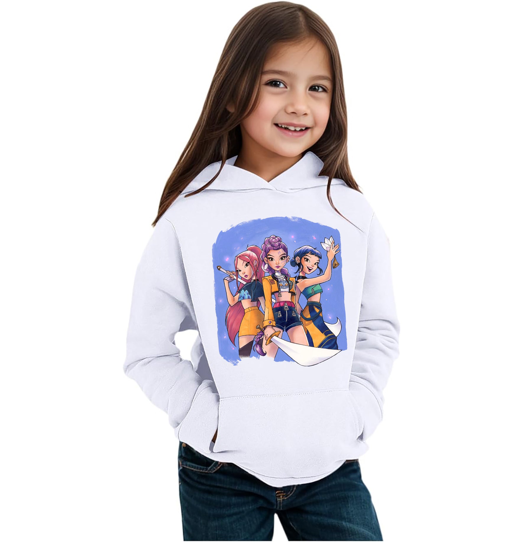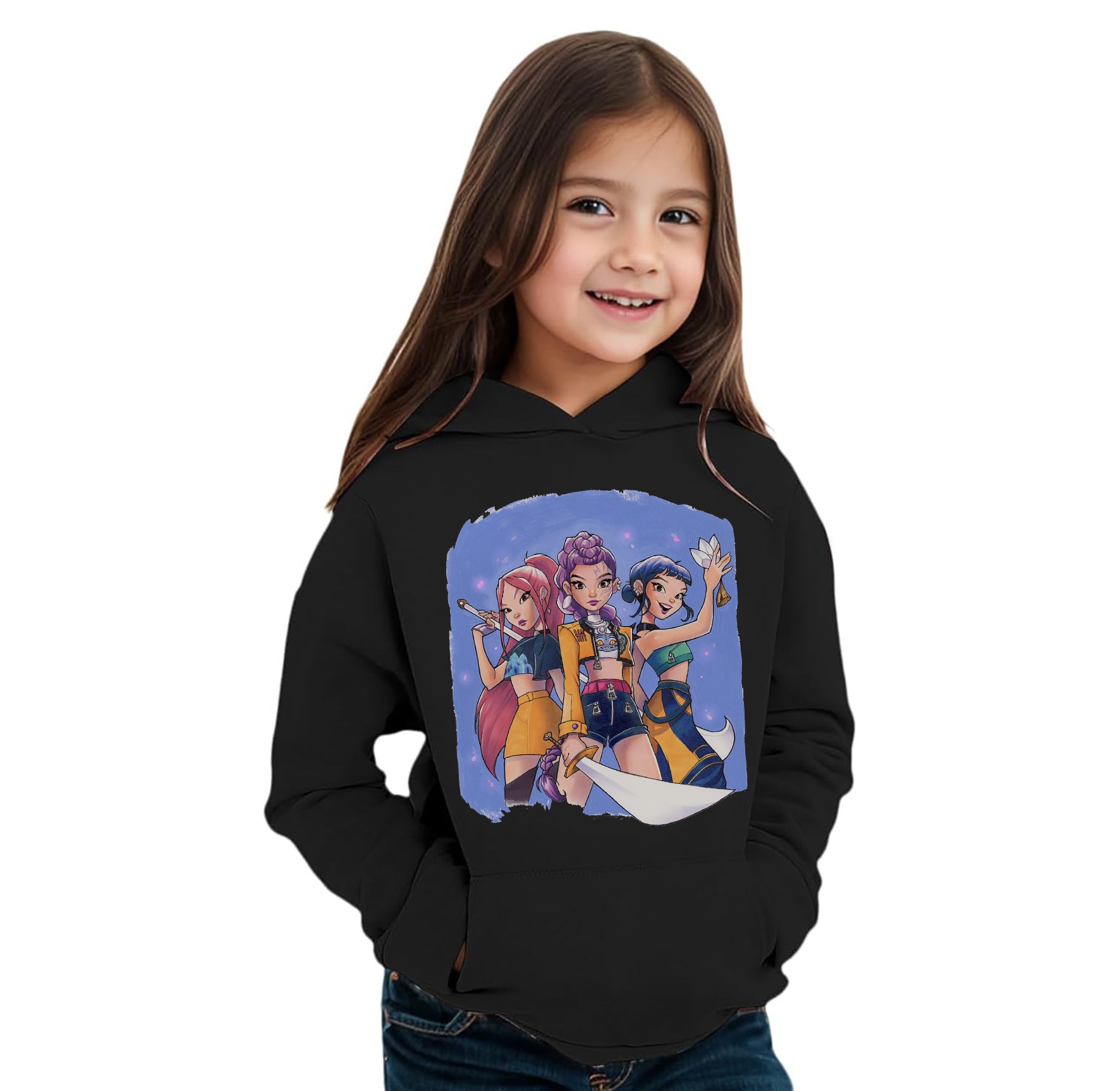 Felpa invernale in misto cotone poliestere, colore bianco o nero con stampa frontale ispirata alle Huntrix. Modello Unisex per bambino, bambina e adulti. Felpa con Cappuccio o modello Girocollo. Consulta la tabella taglie e scegli quella che fa per te.
