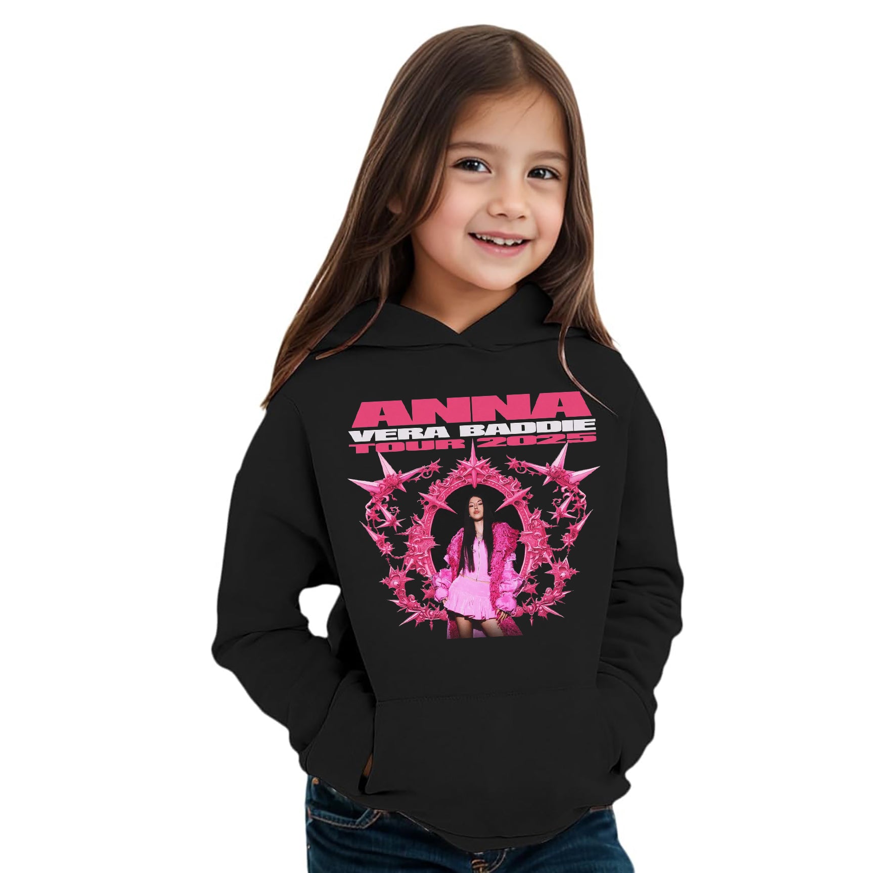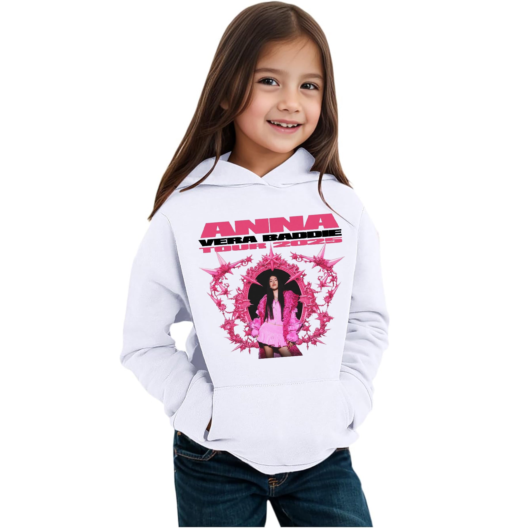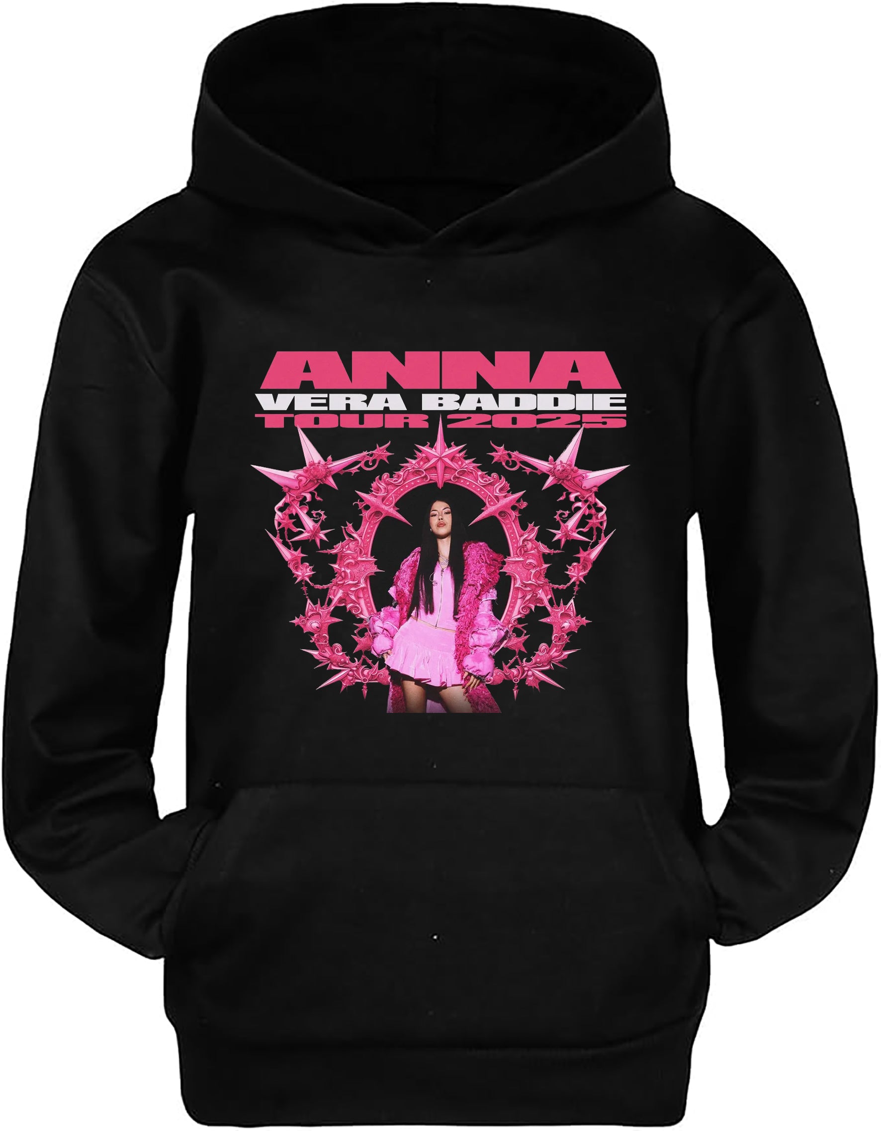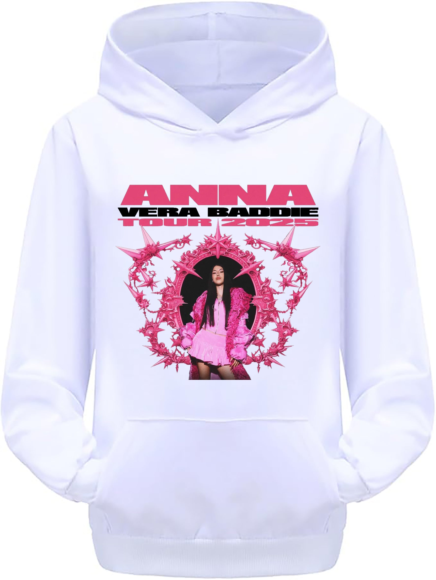 Felpa invernale in misto cotone poliestere, colore bianco o nero di Anna Peppe "Vera Baddie" Tour 2025. Modello Unisex per bambino, bambina e adulti. Felpa con Cappuccio o modello Girocollo. Consulta la tabella taglie e scegli quella che fa per te.