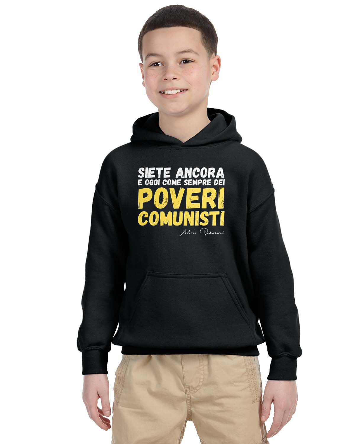 Felpa Silvio Berlusconi - Siete ancora ed oggi come sempre dei Poveri Comunisti. Edizione limitata in misto cotone poliestere, colore nero. Modello Unisex per bambino, bambina, ragazzi e adulti. Felpa con Cappuccio o modello Girocollo. Consulta la tabella taglie e scegli quella che fa per te.