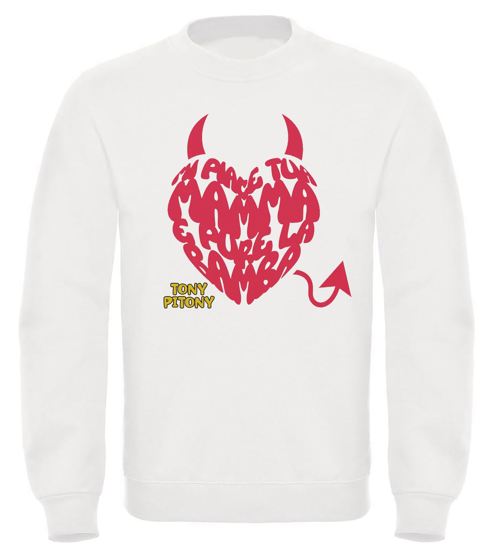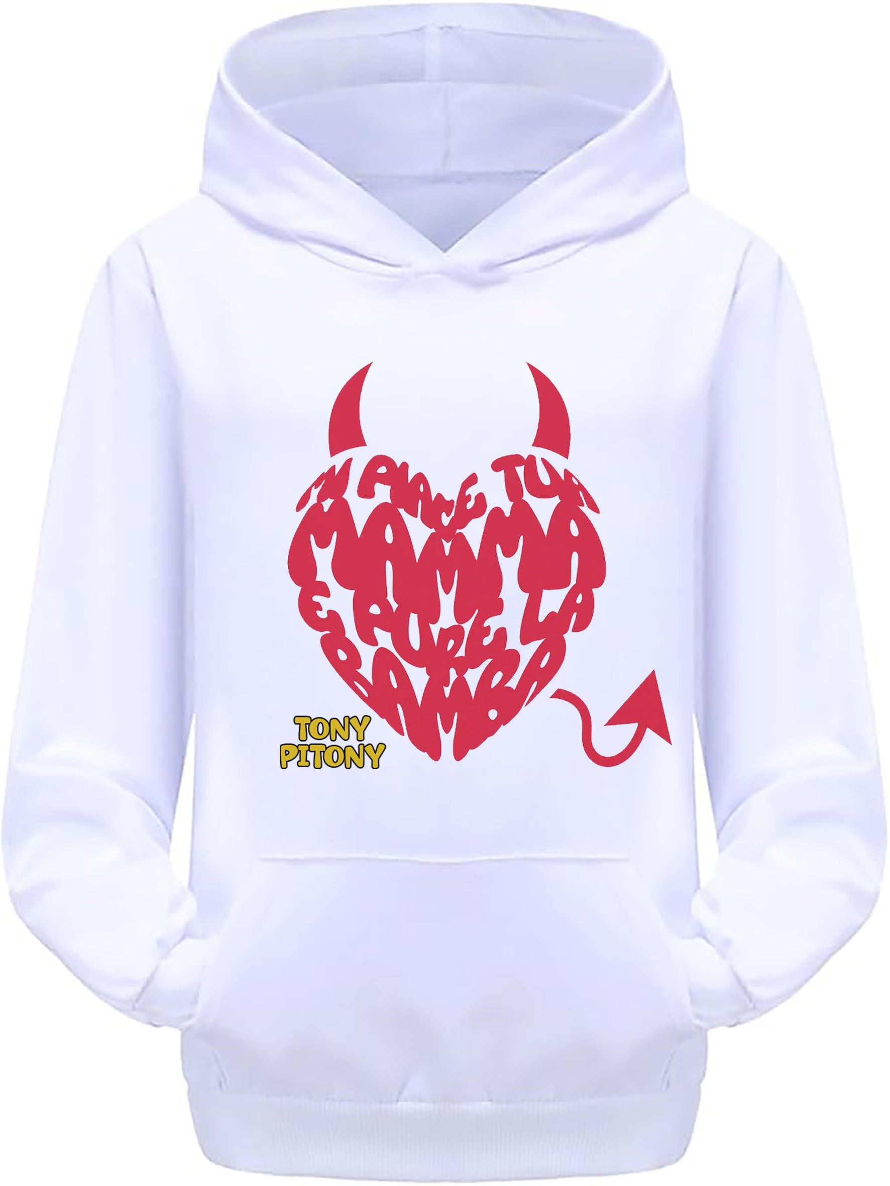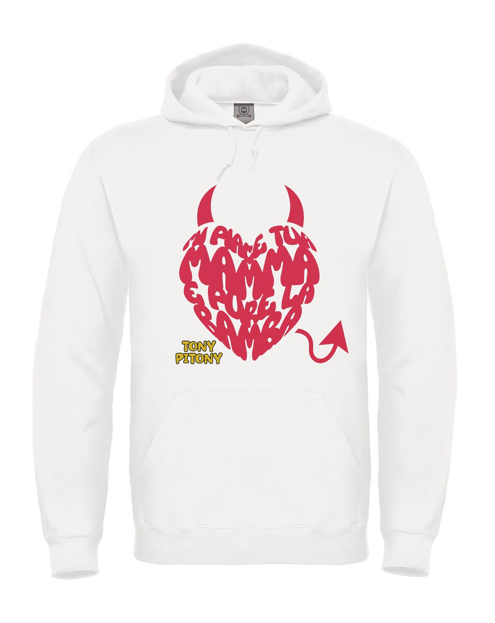 Felpa di TonyPitony - Mi piace tua mamma e pure la bamba. Felpa invernale in misto cotone poliestere, colore bianco o nero con stampa logo fronte e retro. Modello Unisex per bambino, bambina e adulti. Felpa con Cappuccio o modello Girocollo. Consulta la tabella taglie e scegli quella che fa per te.