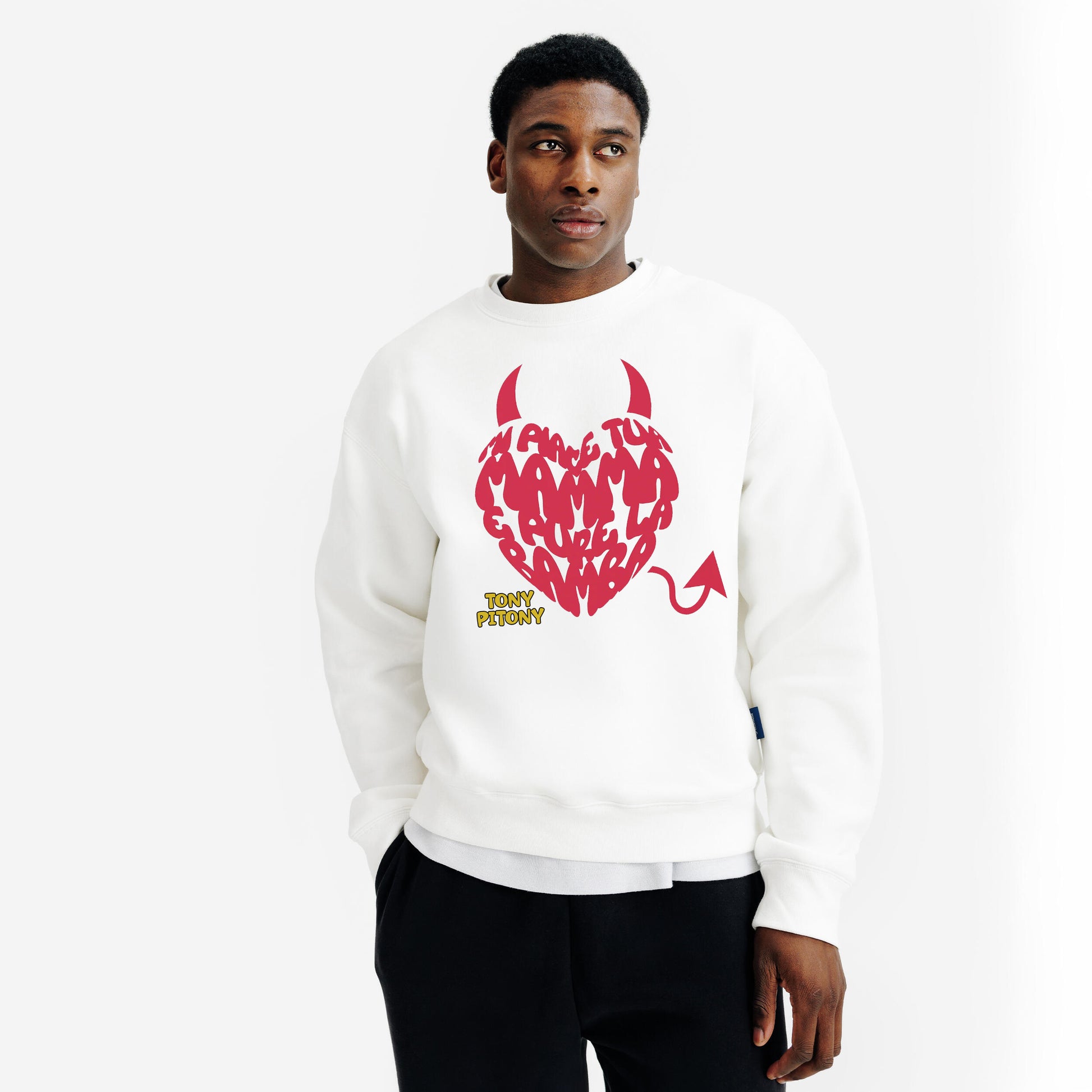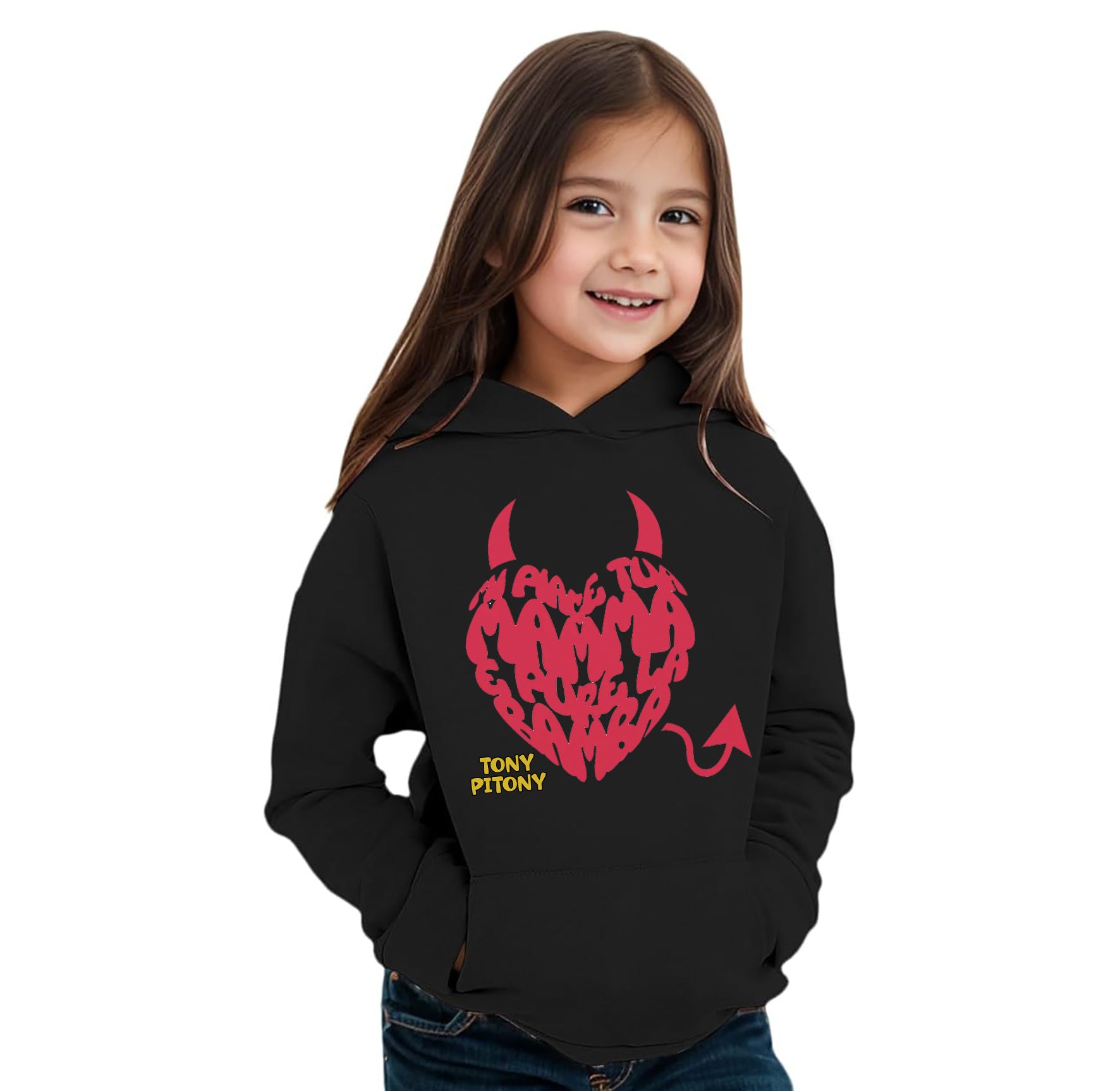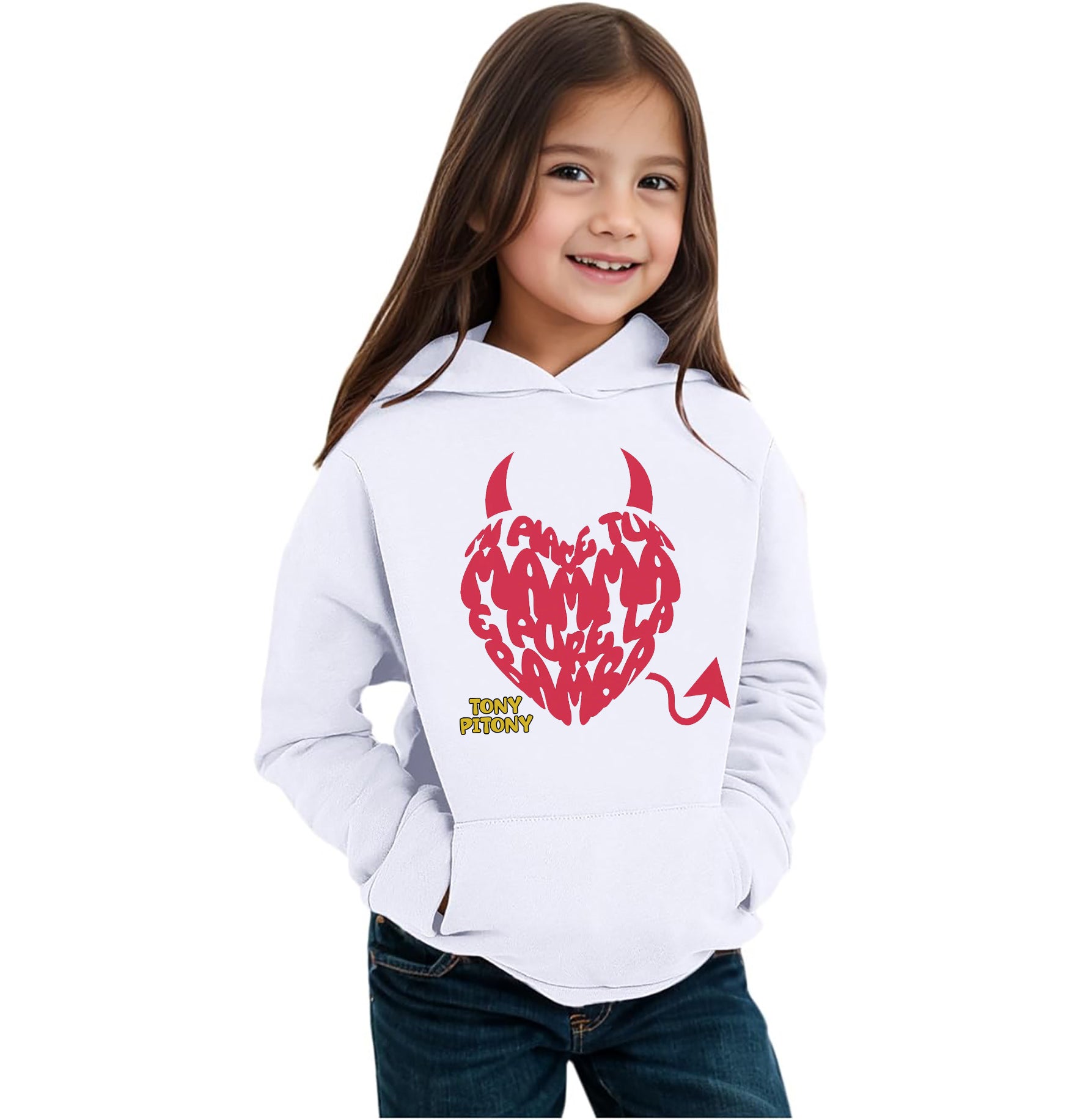 Felpa di TonyPitony - Mi piace tua mamma e pure la bamba. Felpa invernale in misto cotone poliestere, colore bianco o nero con stampa logo fronte e retro. Modello Unisex per bambino, bambina e adulti. Felpa con Cappuccio o modello Girocollo. Consulta la tabella taglie e scegli quella che fa per te.