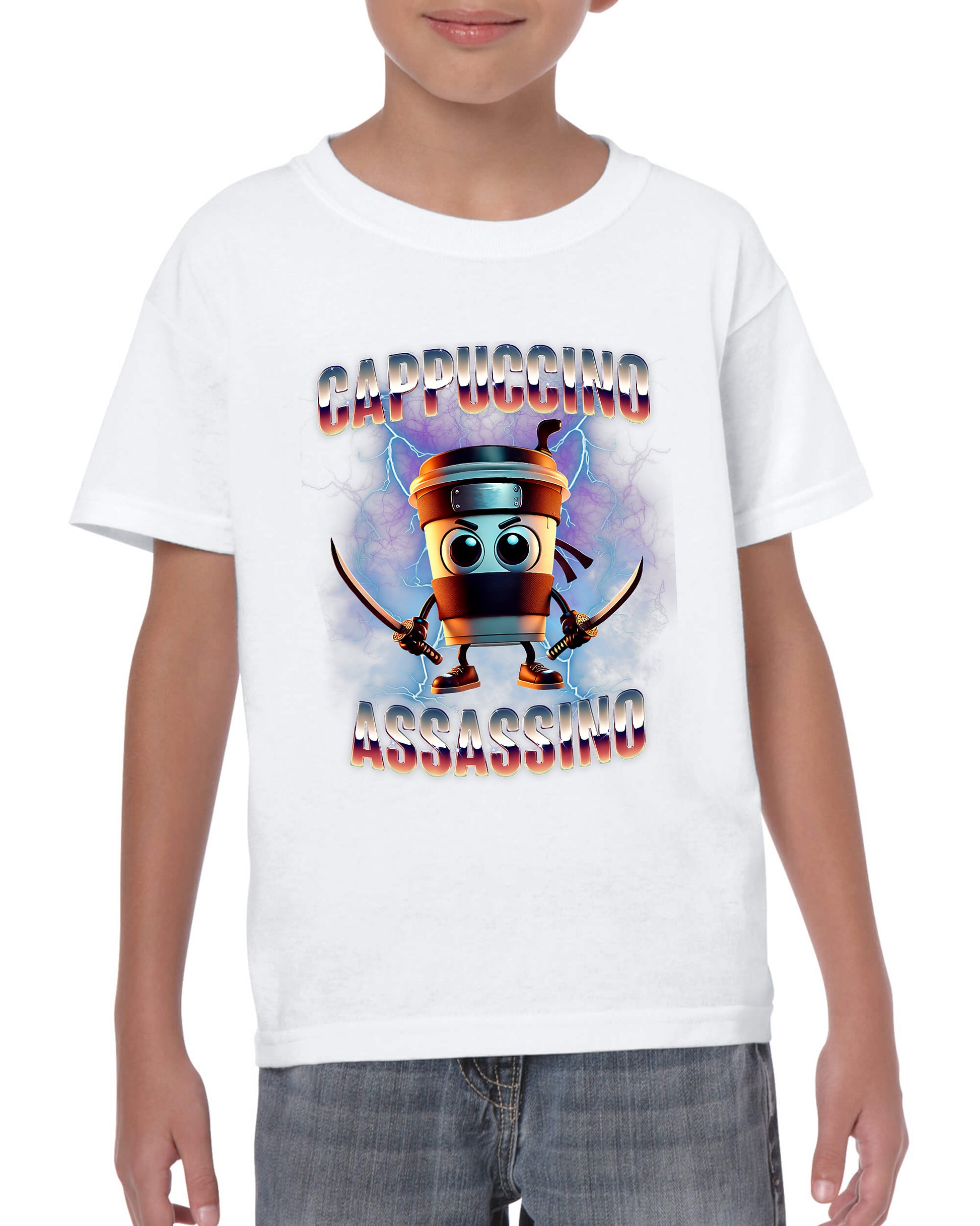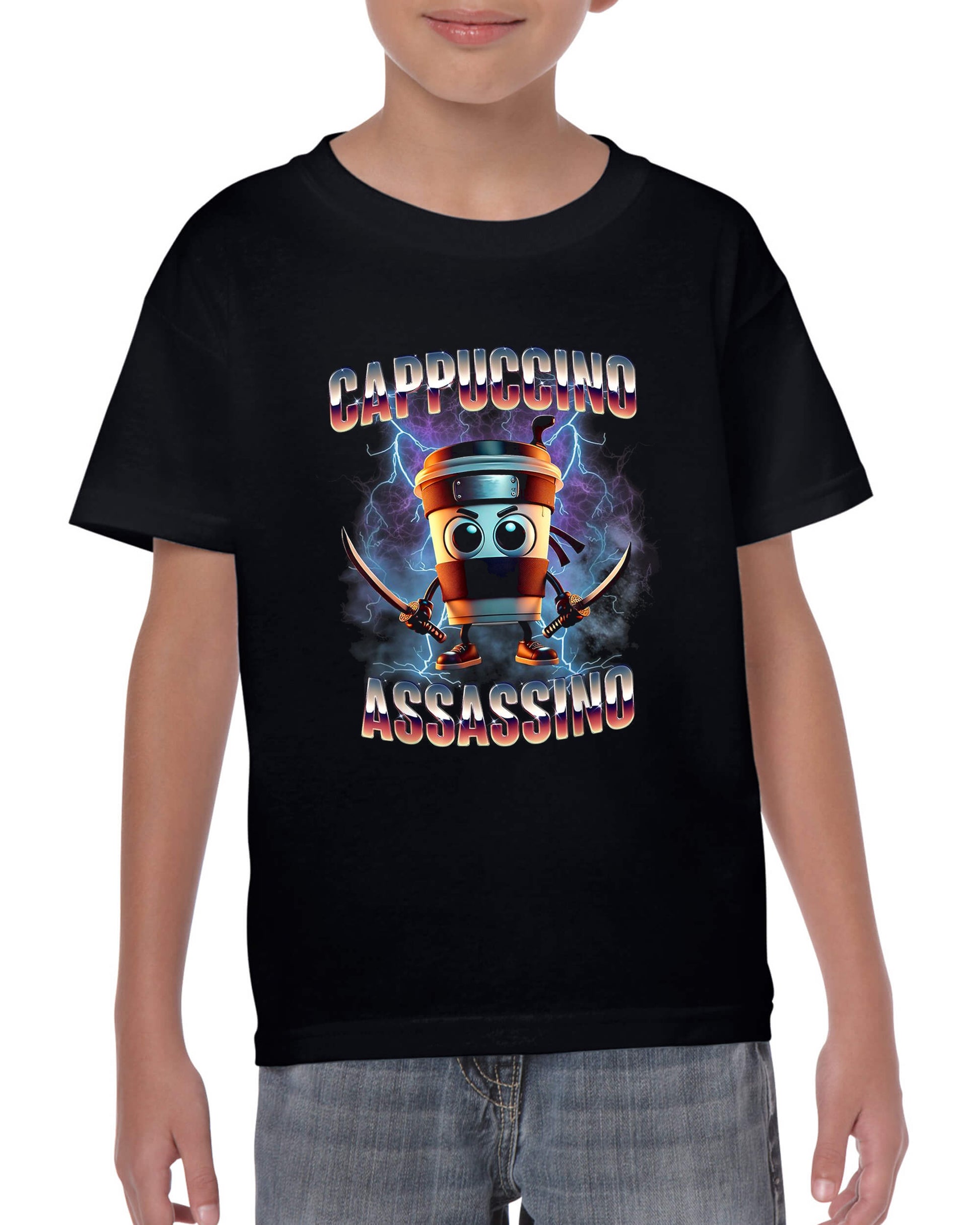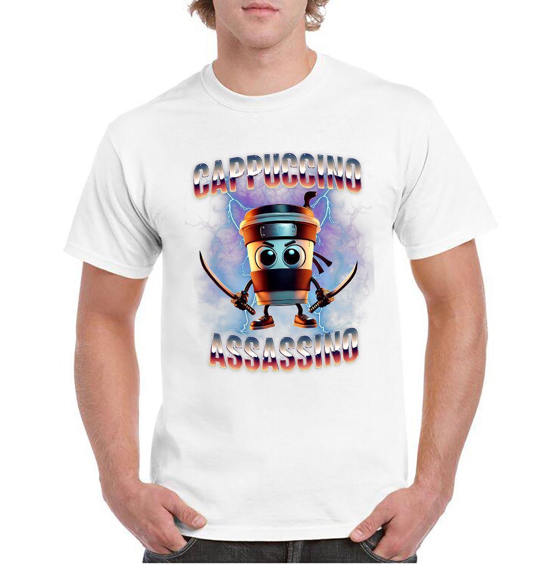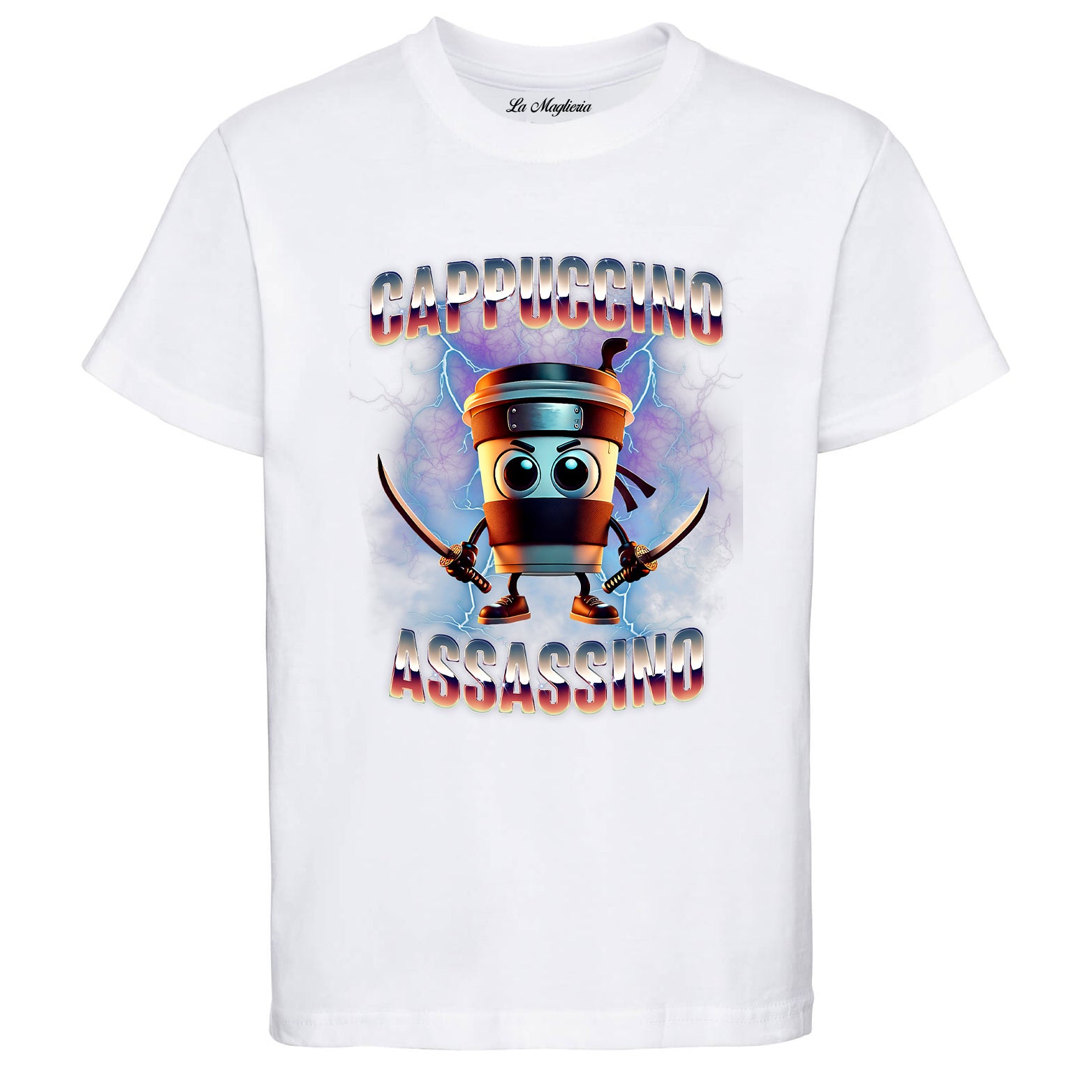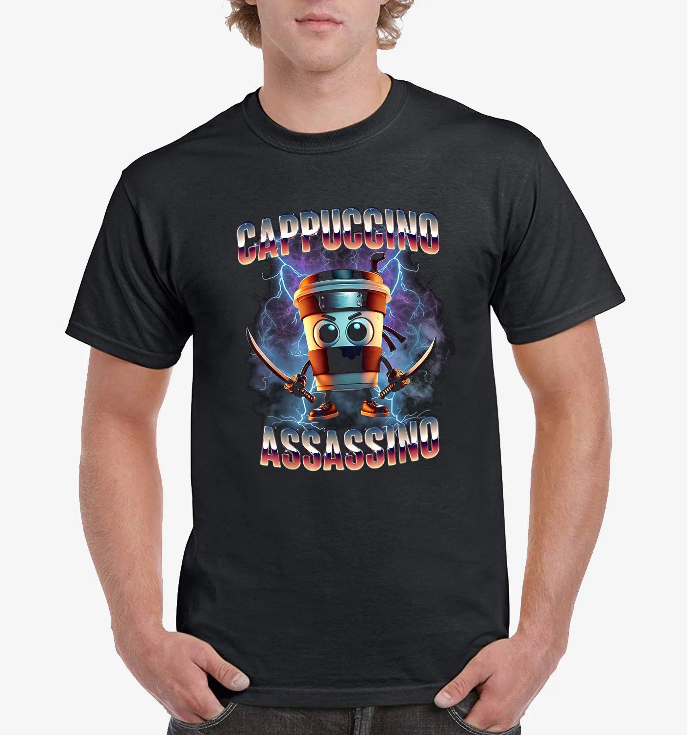 Maglietta dei Brain Rot - Cappuccino Assassino che fanno impazzire i bambini, stampata in cotone 100%, colore bianco o nero. Taglie uomo, donna, ragazzi e bambini. Consulta la tabella taglie e scegli quella che fa per te.