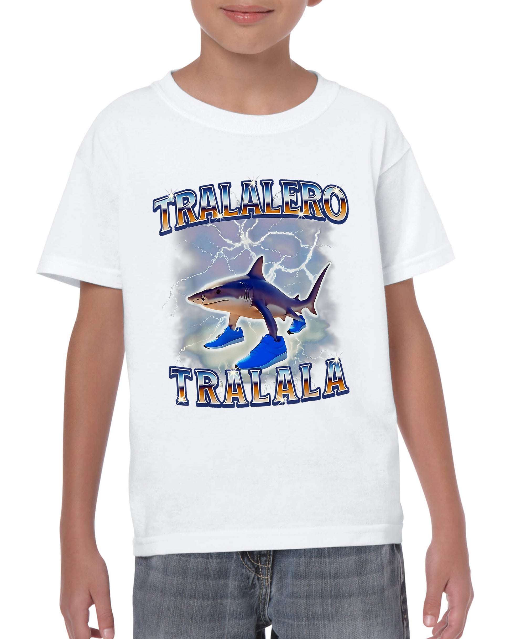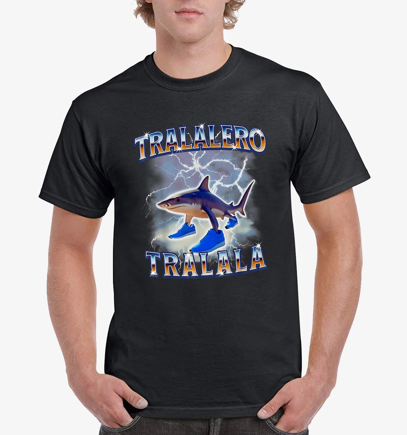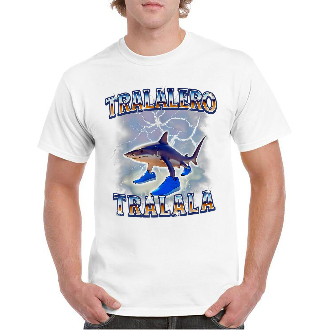 Maglietta dei Brain Rot - Tralalero Tralala che fanno impazzire i bambini, stampata in cotone 100%, colore bianco o nero. Taglie uomo, donna, ragazzi e bambini. Consulta la tabella taglie e scegli quella che fa per te.