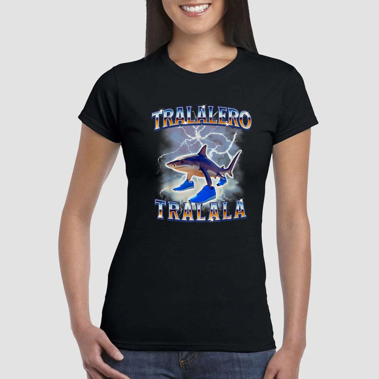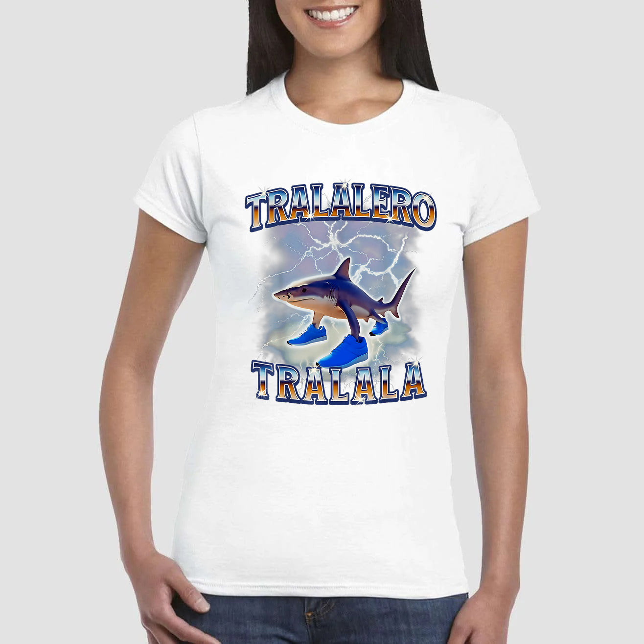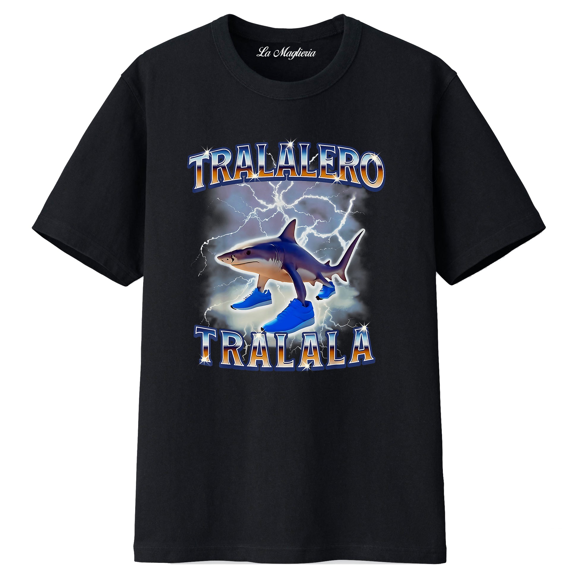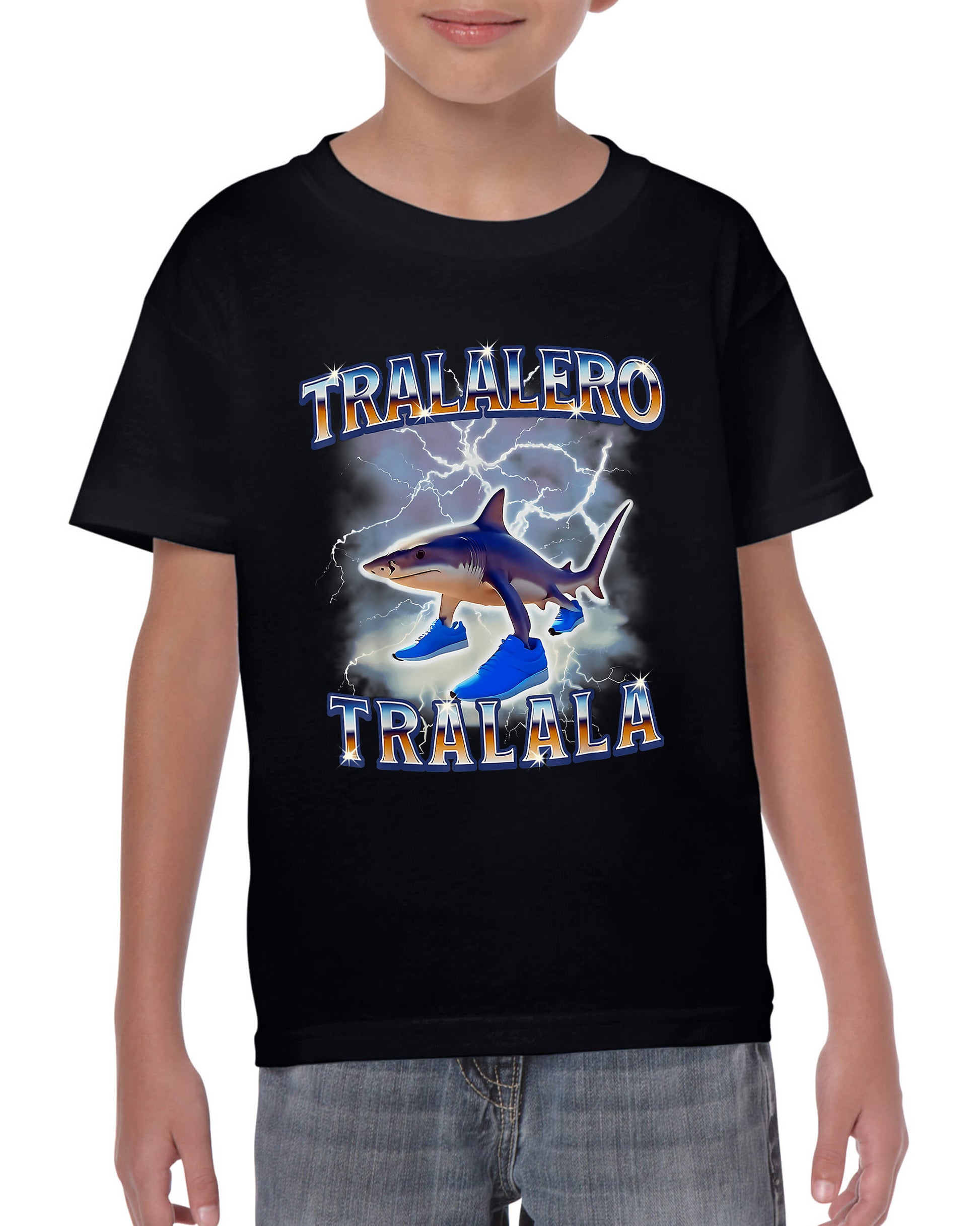 Maglietta dei Brain Rot - Tralalero Tralala che fanno impazzire i bambini, stampata in cotone 100%, colore bianco o nero. Taglie uomo, donna, ragazzi e bambini. Consulta la tabella taglie e scegli quella che fa per te.