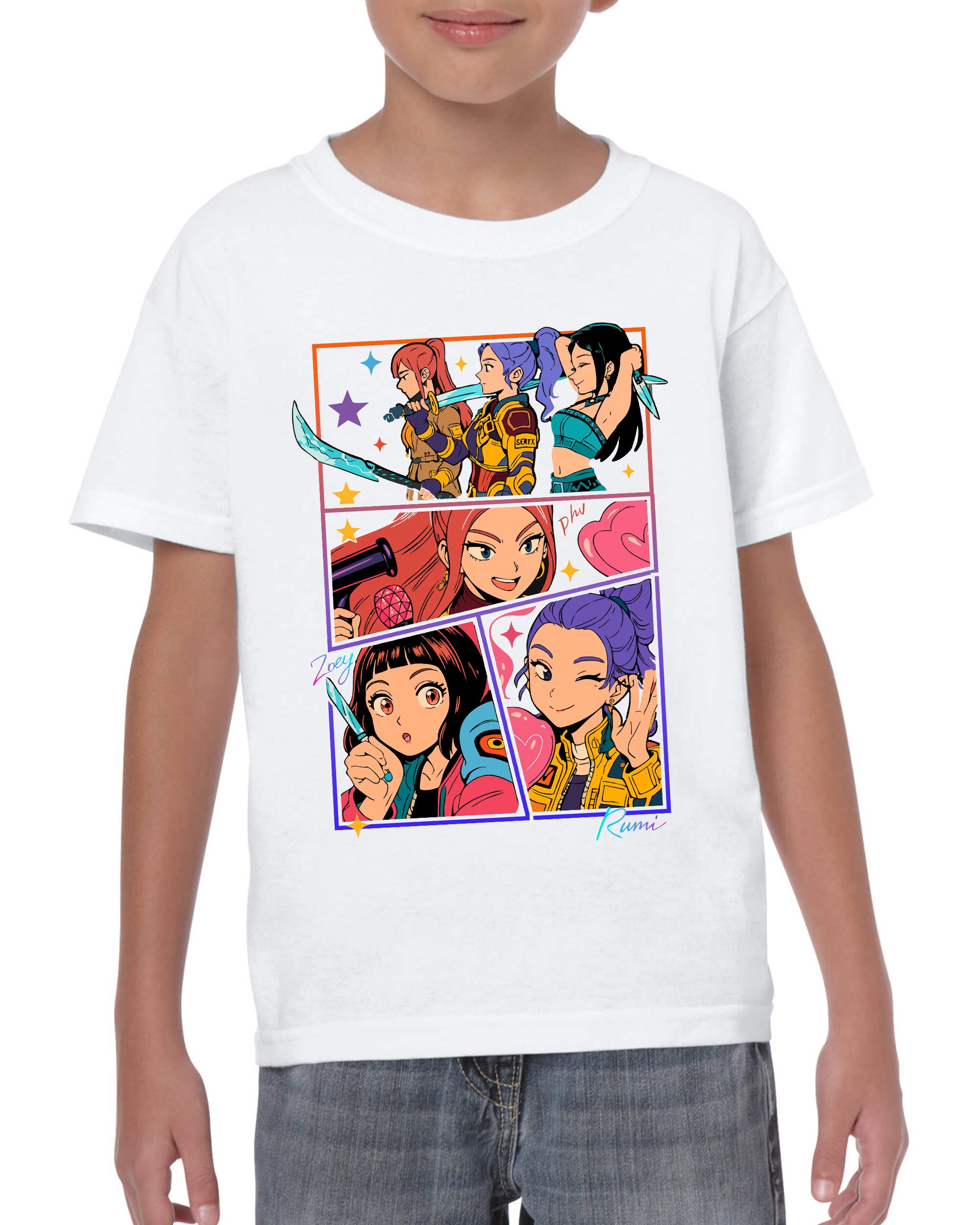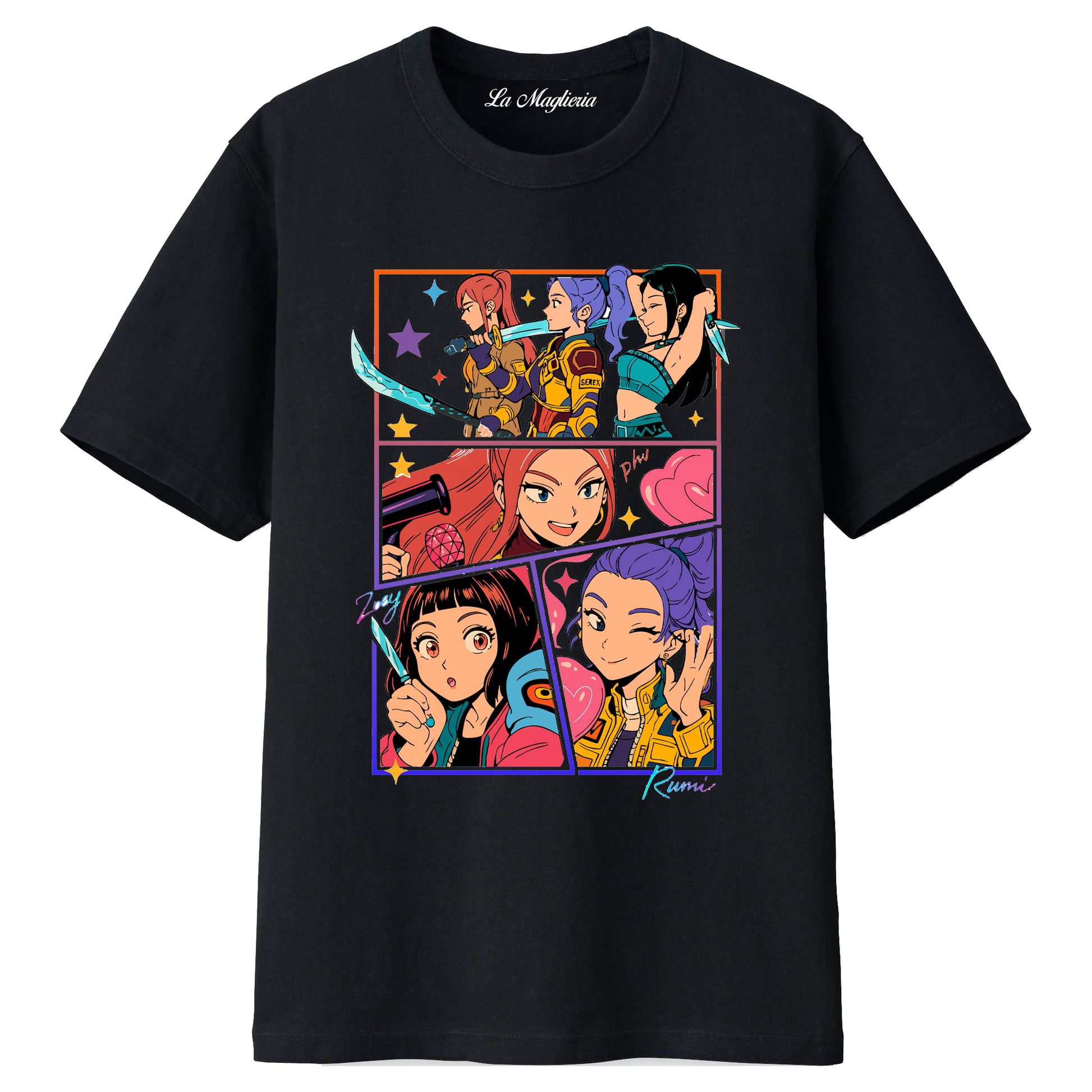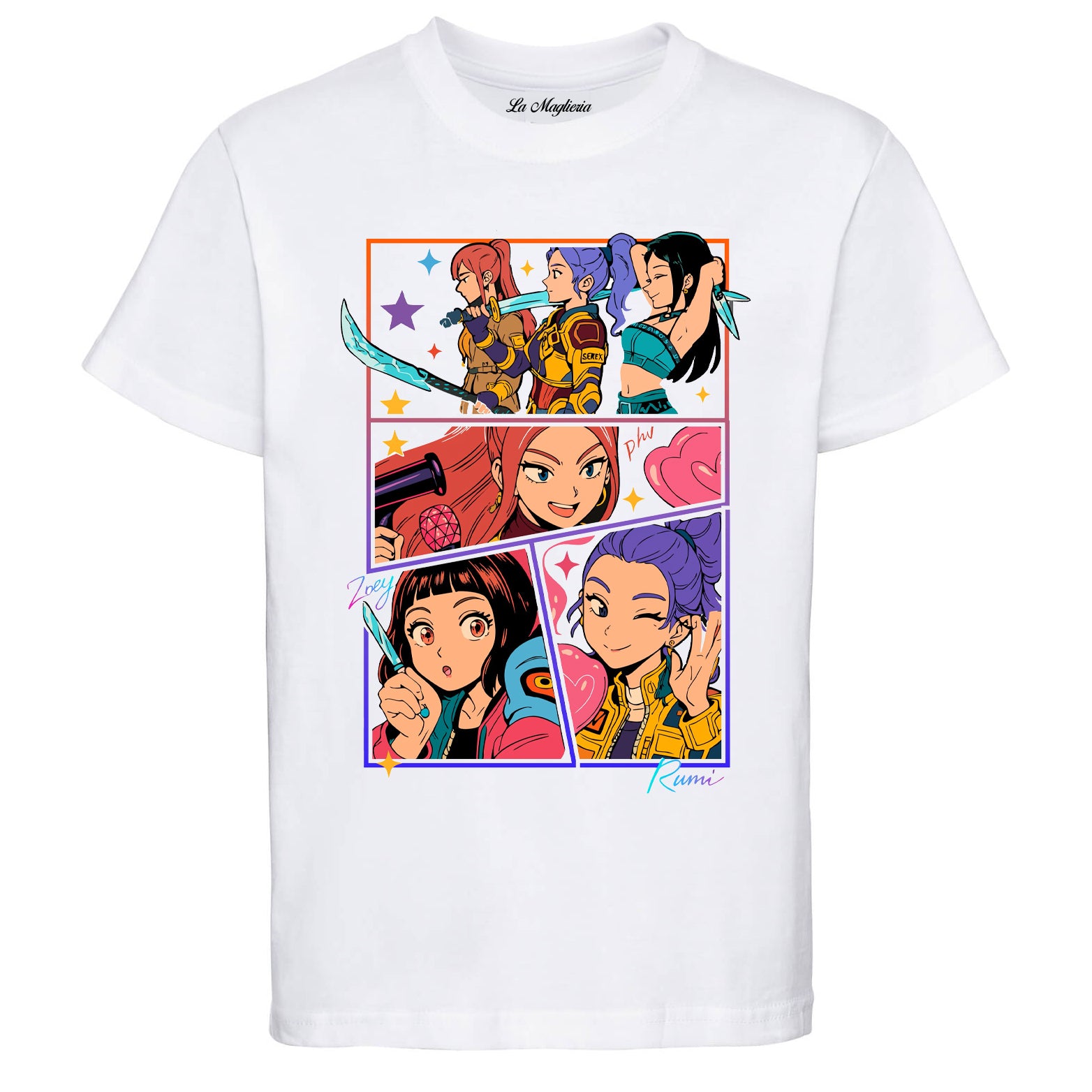 Maglietta delle Huntrix - Il gruppo pop composto da Mira, Zoey e Rumi - Maglietta Unisex per bambini, stampata in cotone 100%, colore bianco o nero. Consulta la tabella taglie e scegli quella che fa per te.