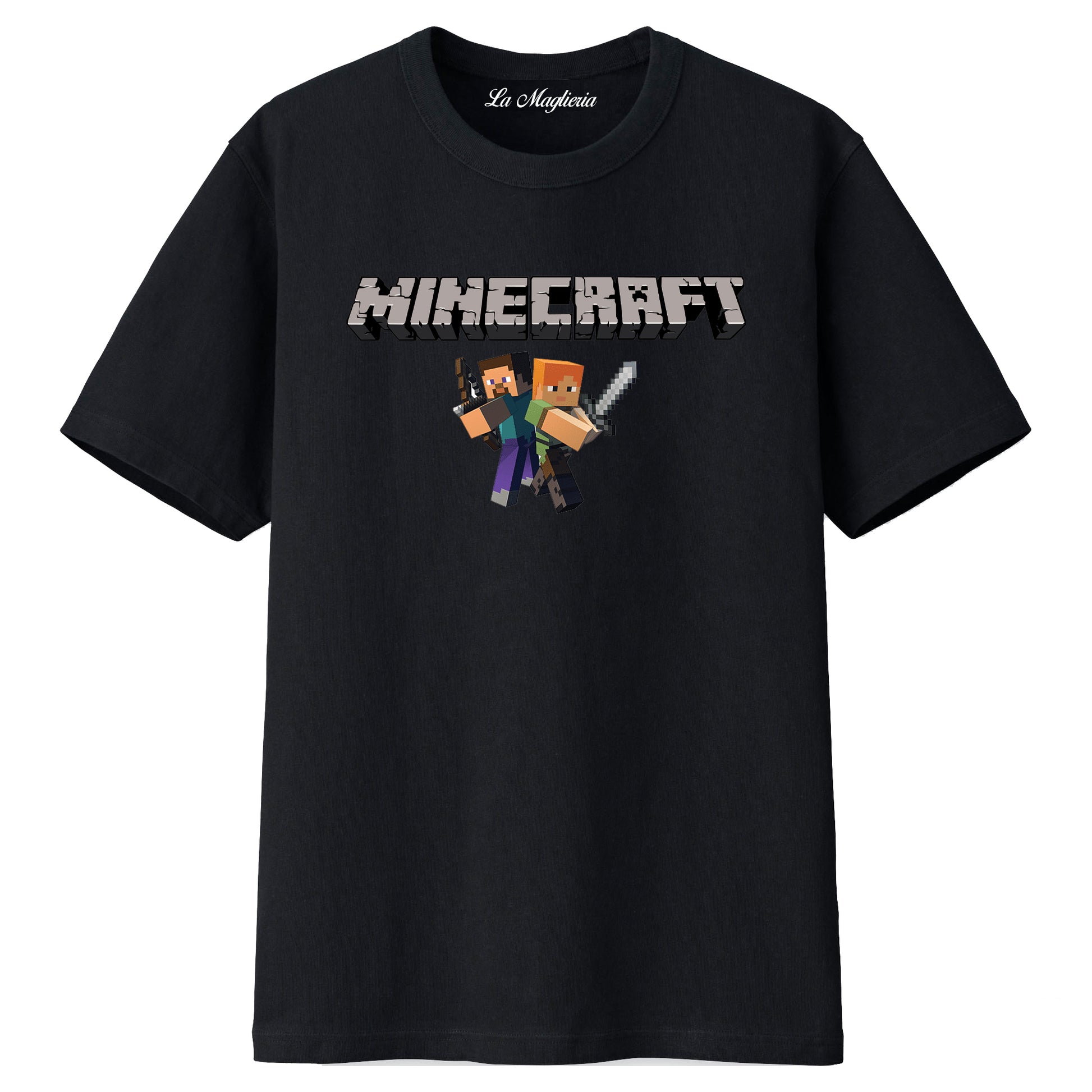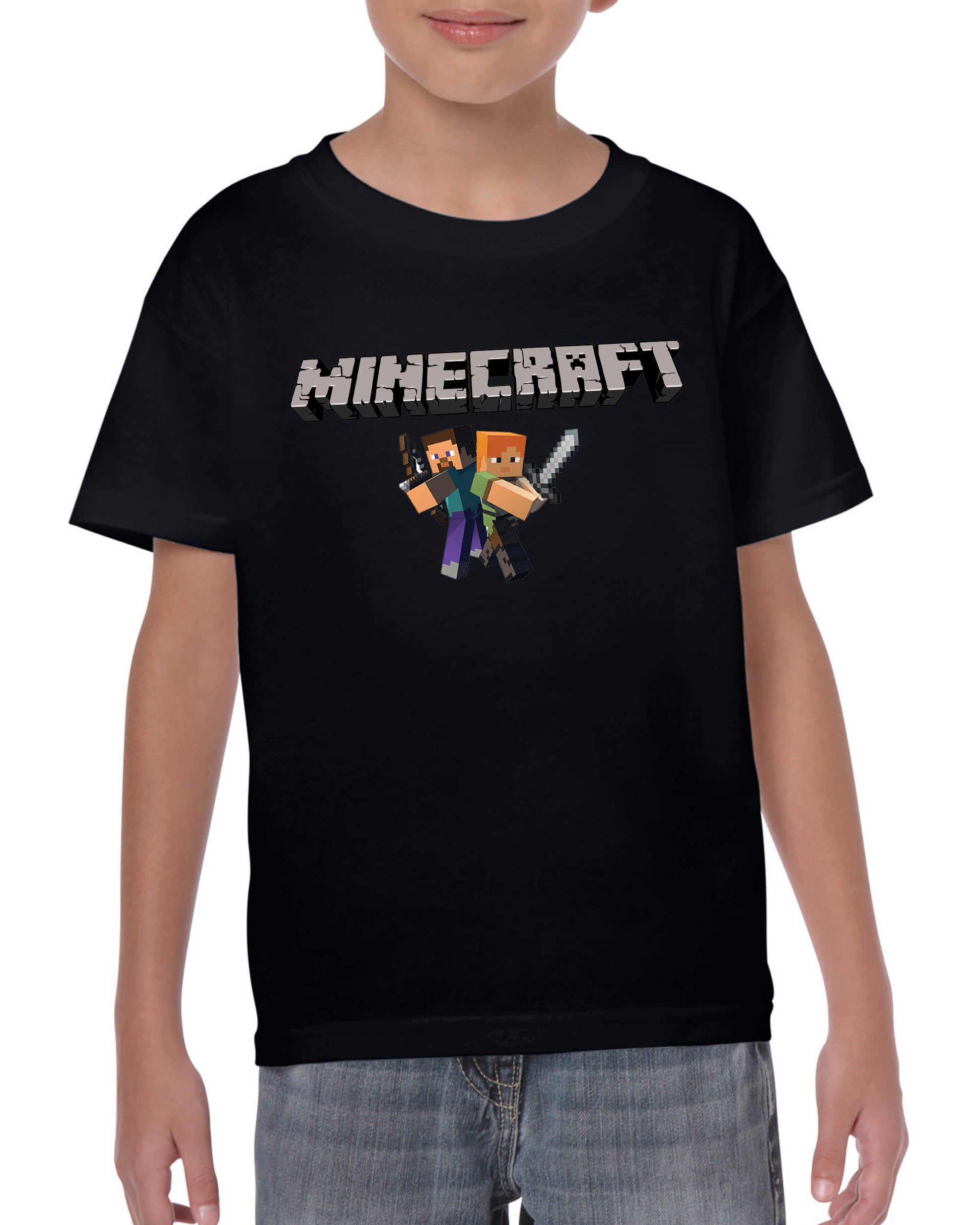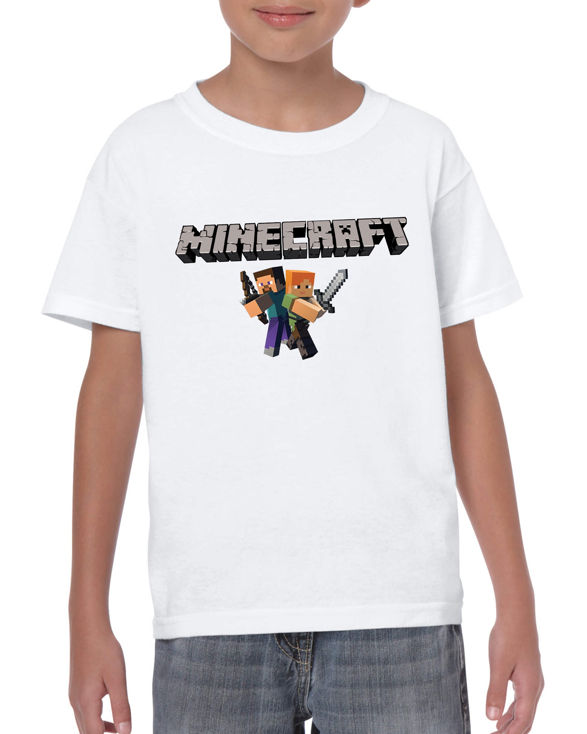 Maglietta ispirata al famoso gioco per bambini MINECRAFT stampata in cotone 100%, colore bianco o nero. Taglie uomo, donna, ragazzi e bambini. Consulta la tabella taglie e scegli quella che fa per te.