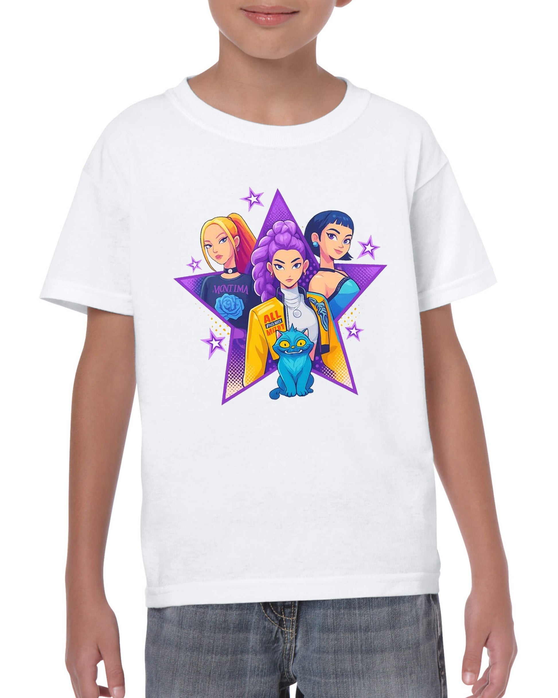 Maglietta delle Huntrix - Il gruppo pop composto da Mira, Zoey e Rumi - Maglietta Unisex per bambini, stampata in cotone 100%, colore bianco o nero. Consulta la tabella taglie e scegli quella che fa per te.