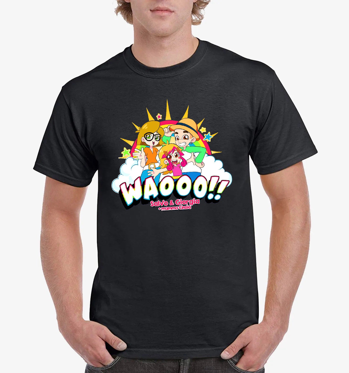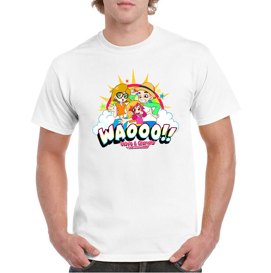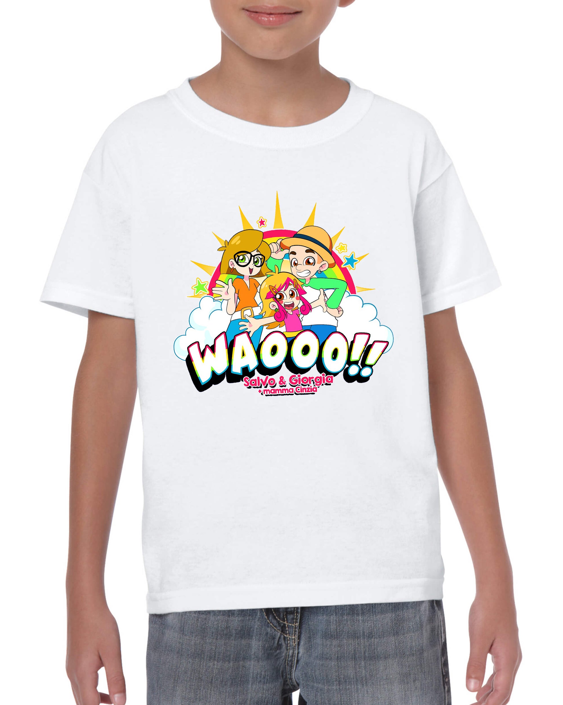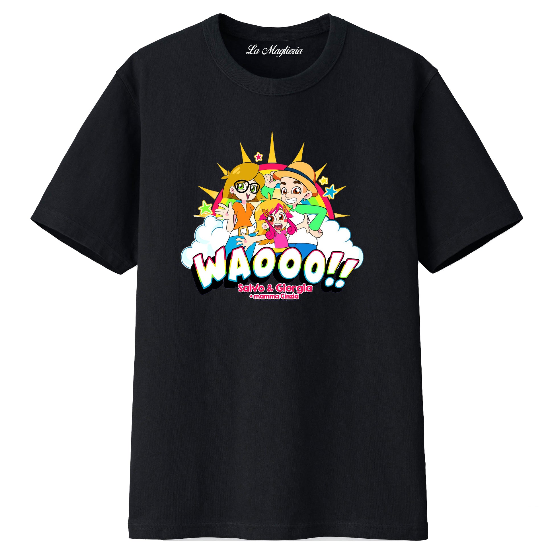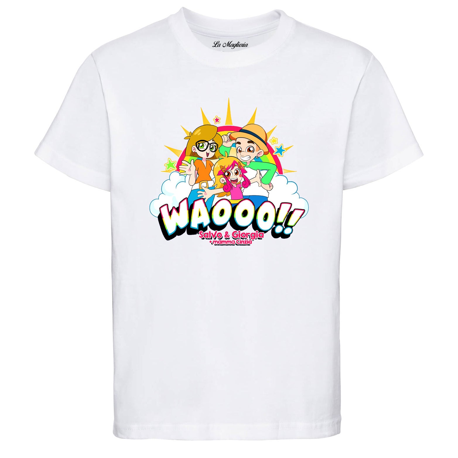 Maglietta stampata in cotone 100%, colore bianco o nero di Salvo e Giorgia. Taglie bambini, ragazzi e adulti. Consulta la tabella taglie e scegli quella che fa per te.