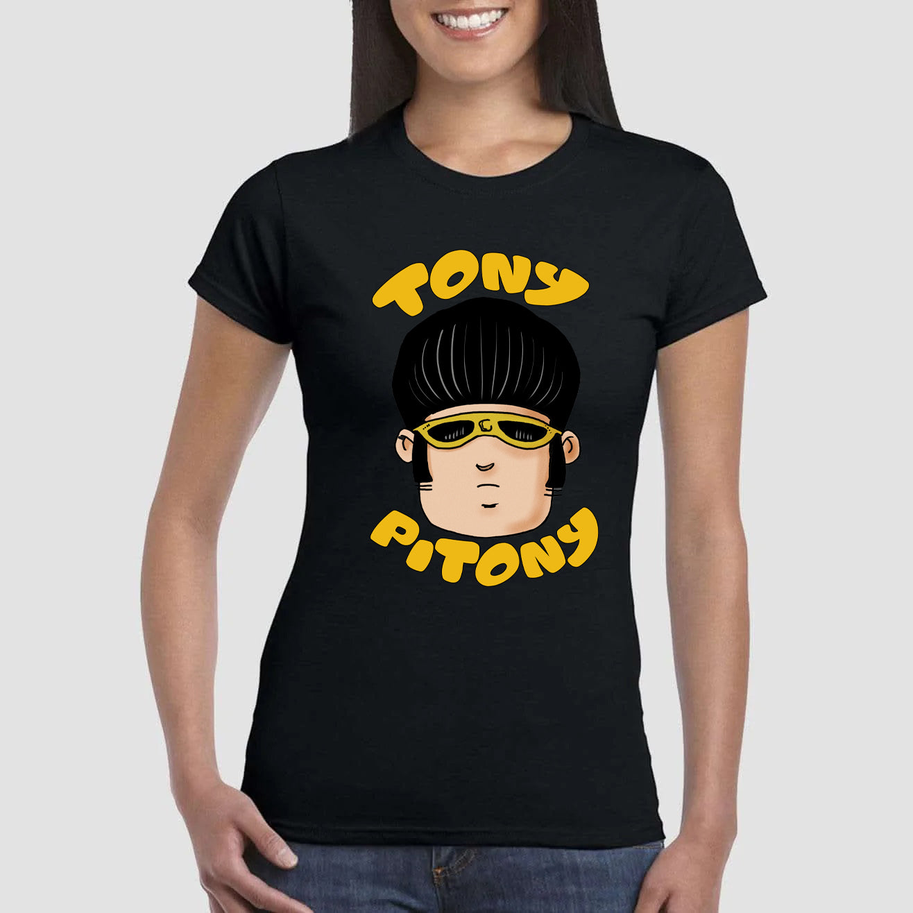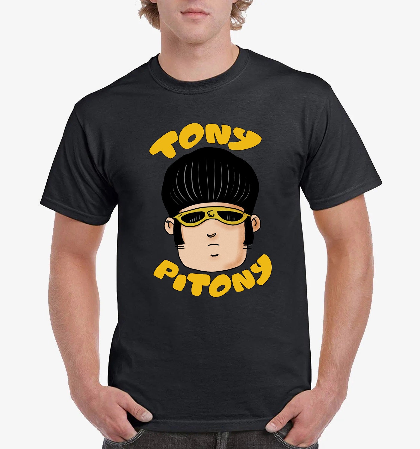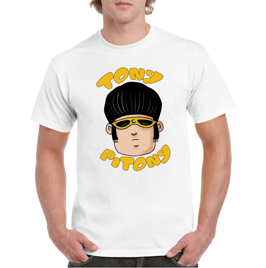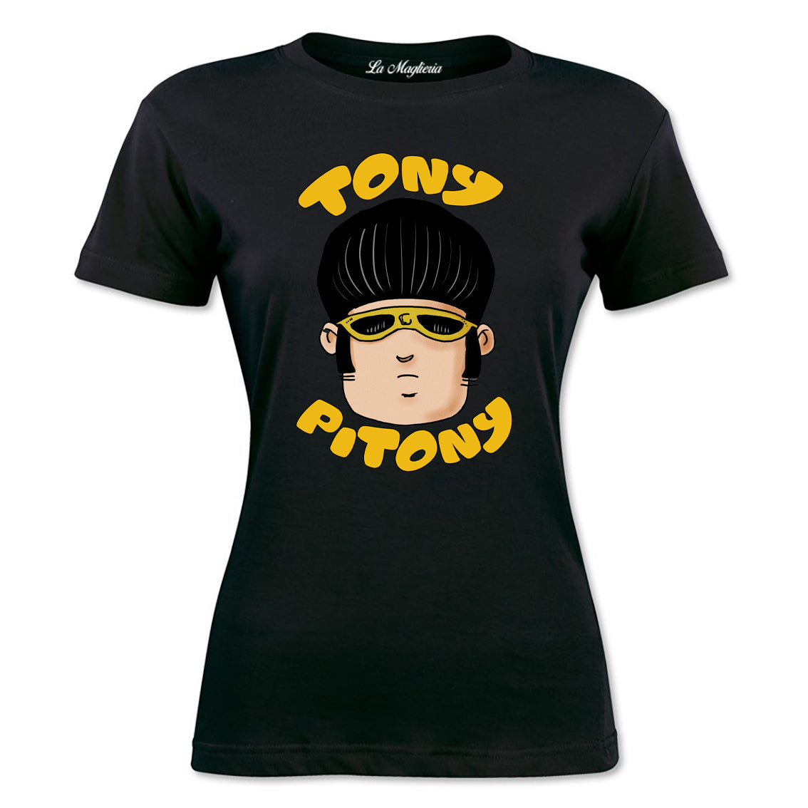 Maglietta stampata in cotone 100%, colore bianco o nero del mitico TONY PITONY. Taglie uomo donna, bambini, ragazzi e adulti. Consulta la tabella taglie e scegli quella che fa per te.