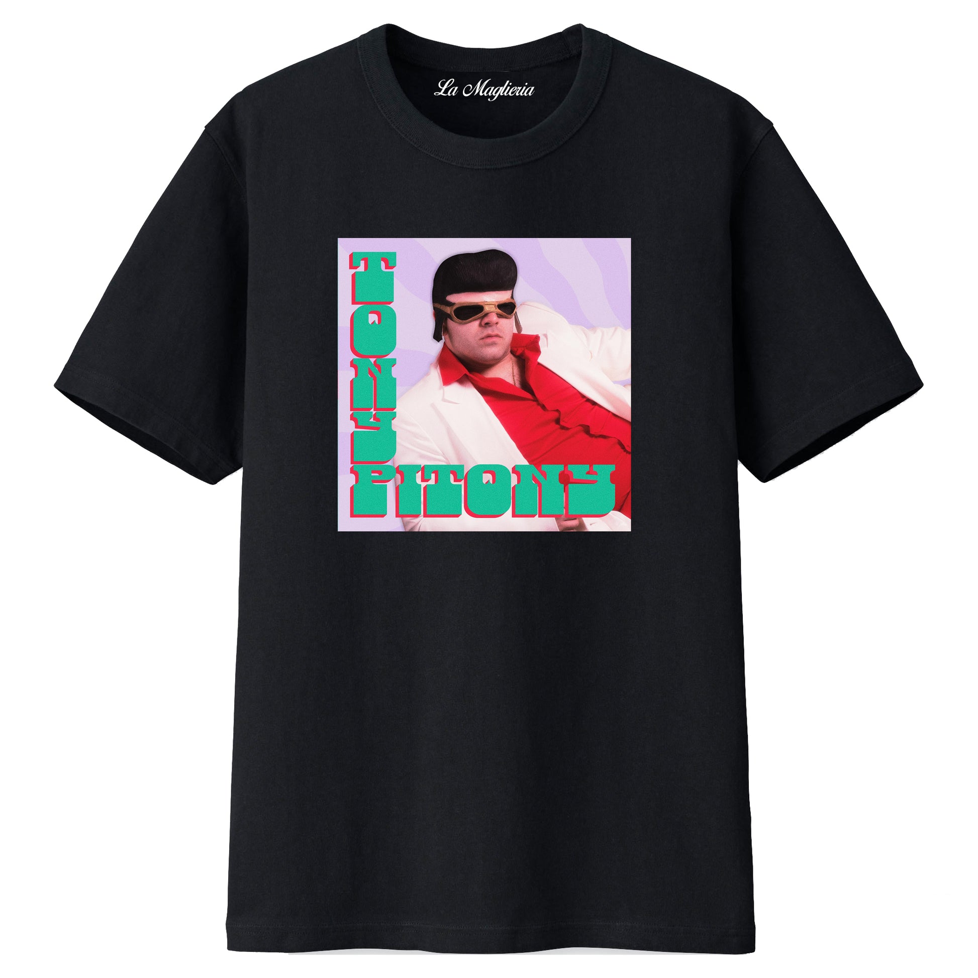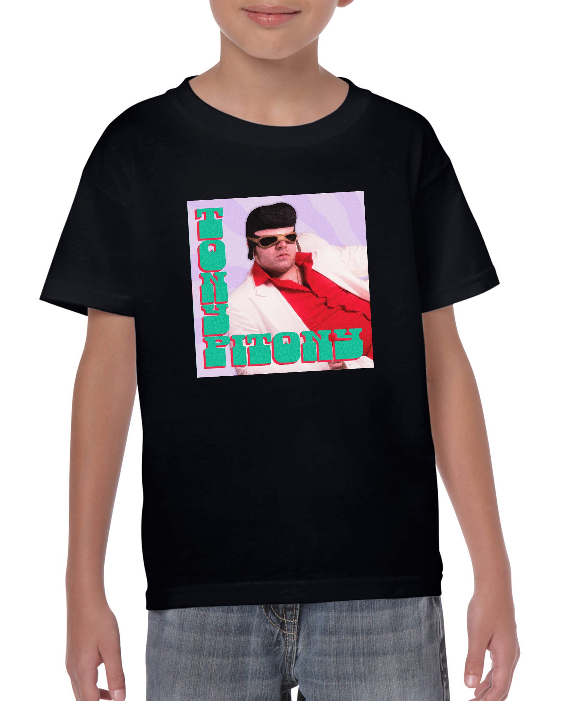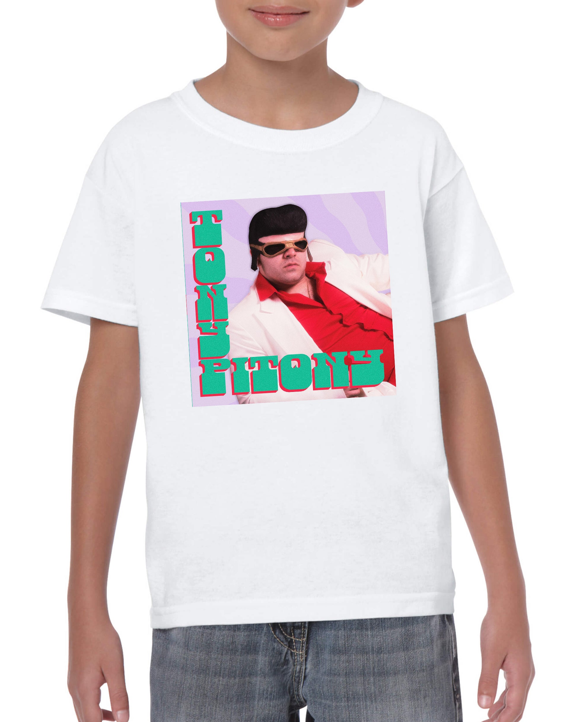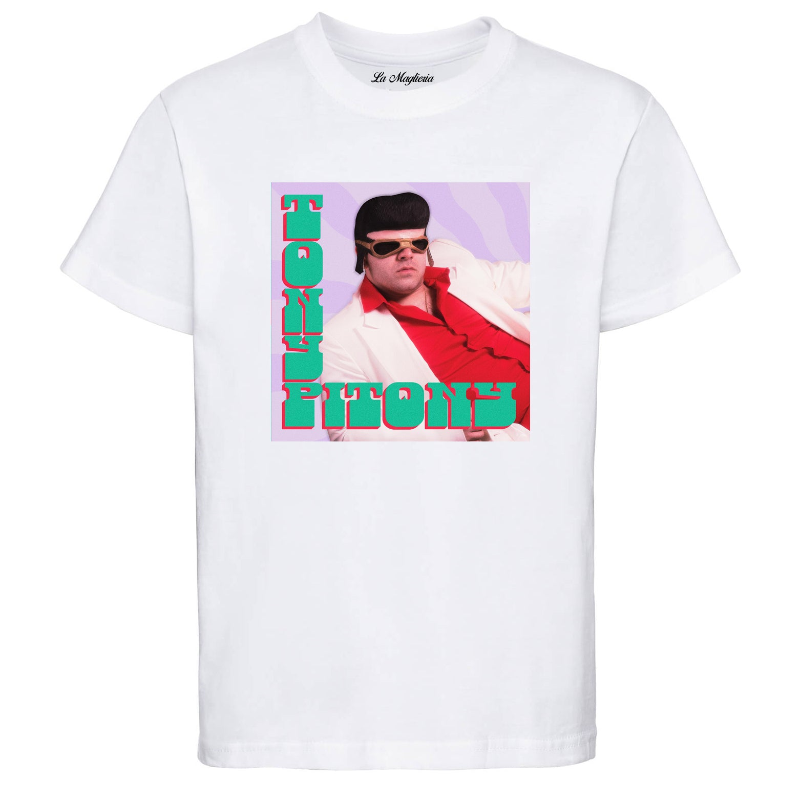 Maglietta stampata in cotone 100%, colore bianco o nero del mitico TONY PITONY. Taglie uomo donna, bambini, ragazzi e adulti. Consulta la tabella taglie e scegli quella che fa per te.