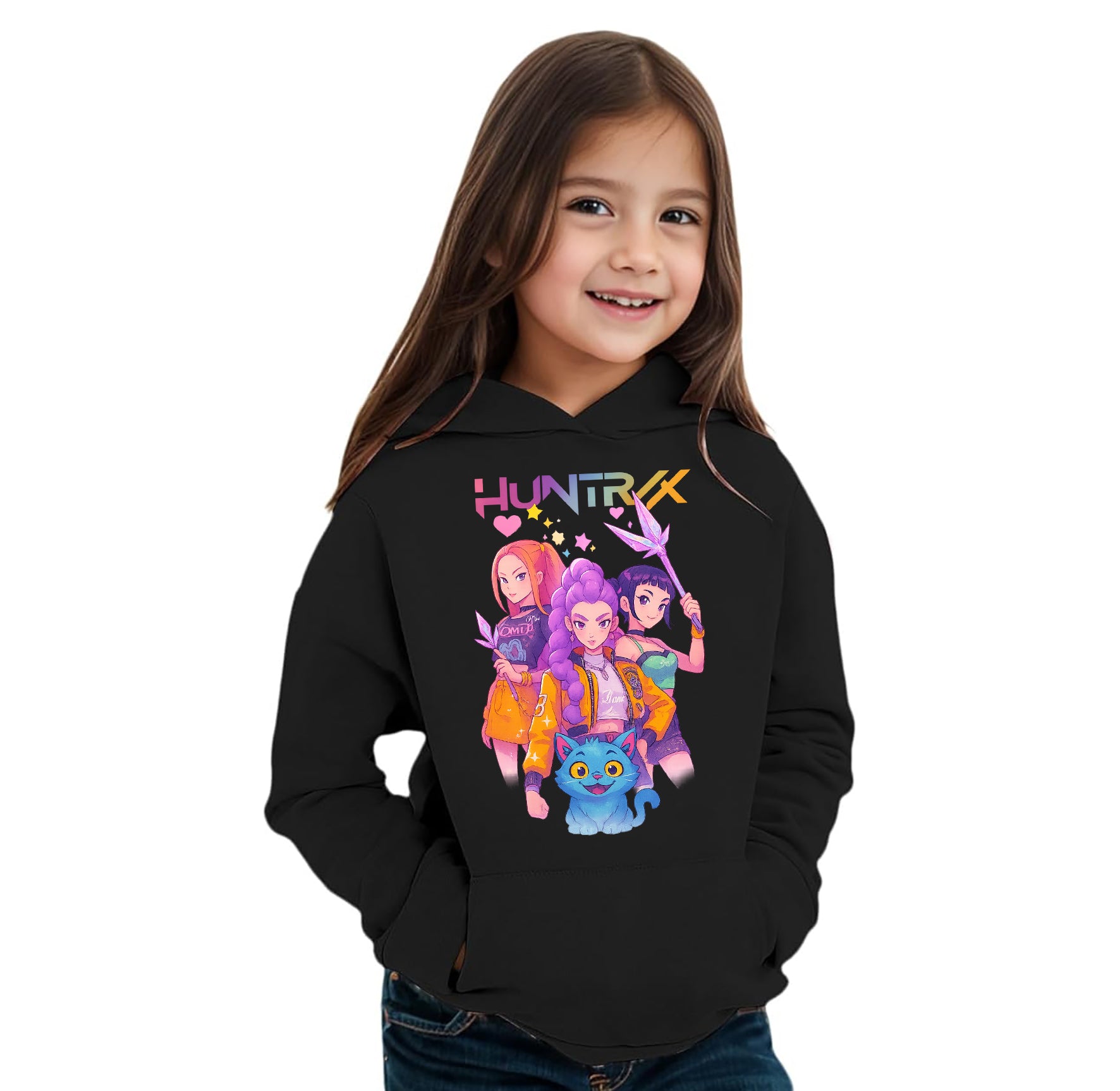 Felpa invernale in misto cotone poliestere, colore bianco o nero con stampa frontale ispirata alle Huntrix. Modello Unisex per bambino, bambina e adulti. Felpa con Cappuccio o modello Girocollo. Consulta la tabella taglie e scegli quella che fa per te.